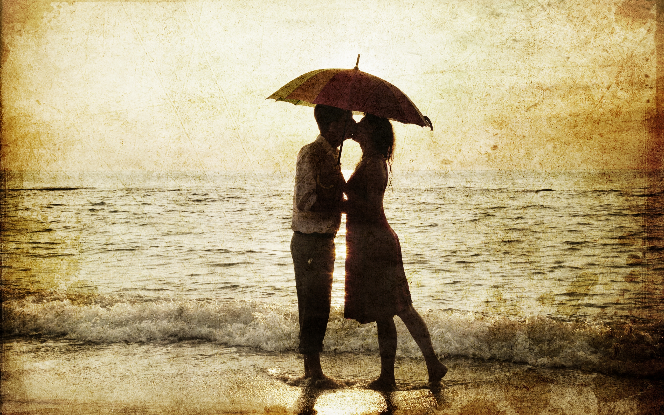 Description: A couple kissing under an umbrella on the beach at sunset or sunrise time.