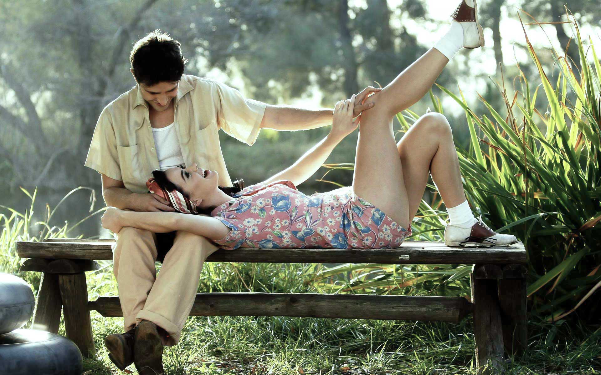 Description: A man is sitting on a bench while a woman is laying on the bench with her leg up on the bench.