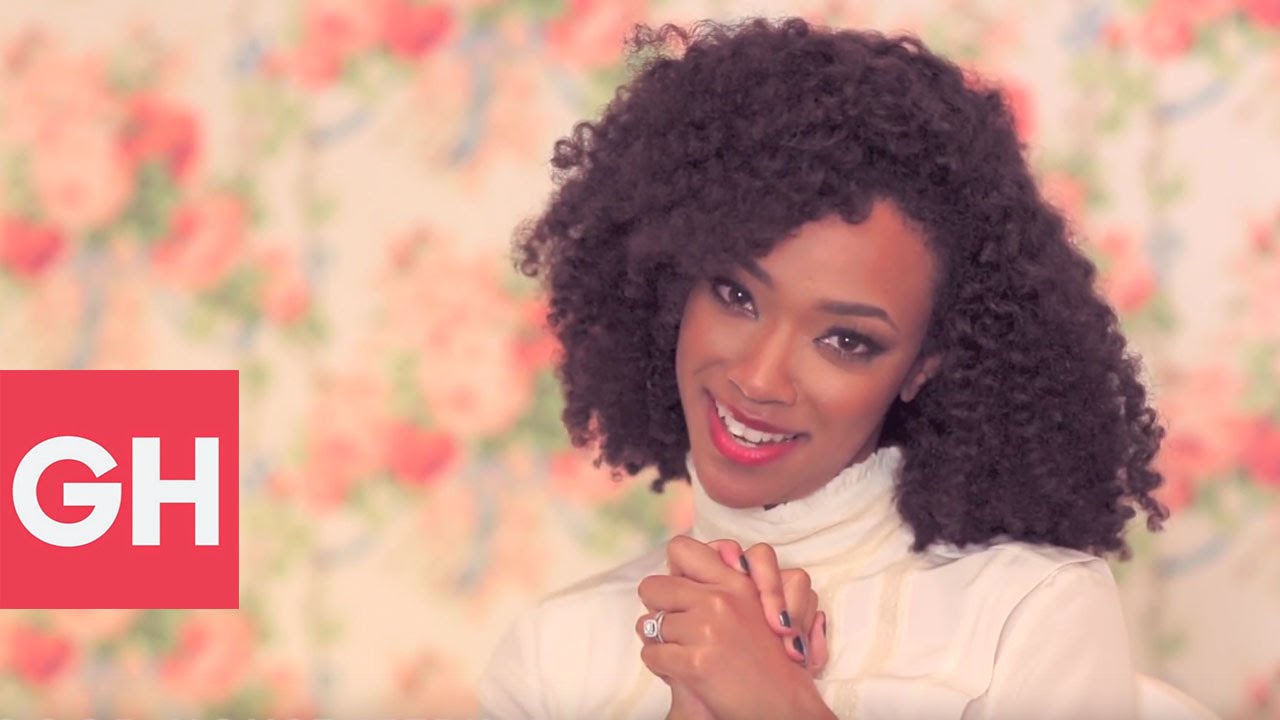 Description: A woman with a white shirt and a red and white floral wallpaper behind her is a red h logo.