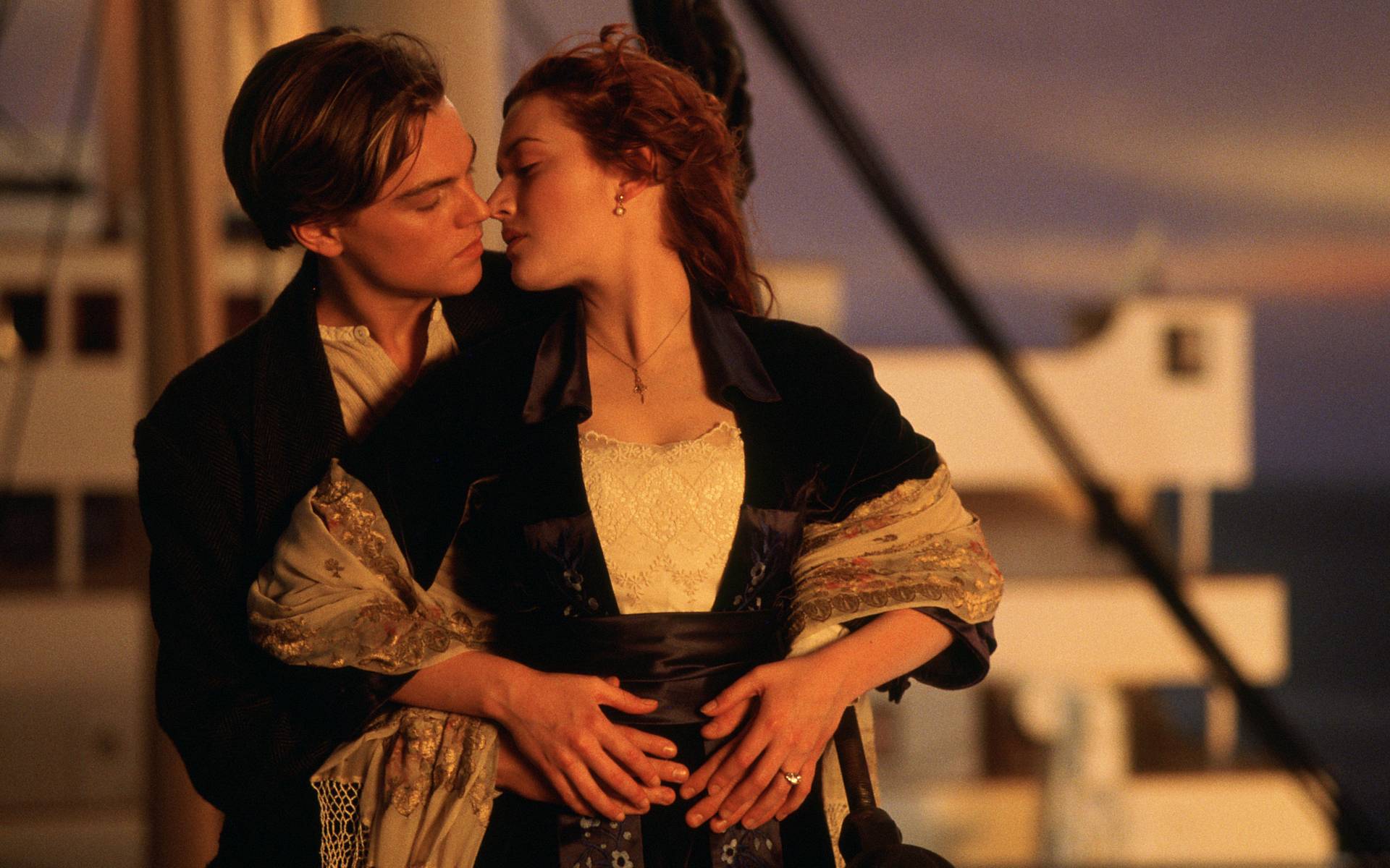 Description: A man and a woman are kissing on a boat deck at sunset or sunrise time.