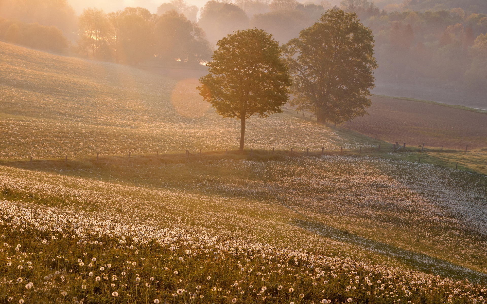 Description: A field with a tree and a path in the middle of it with a sun shining through the trees.