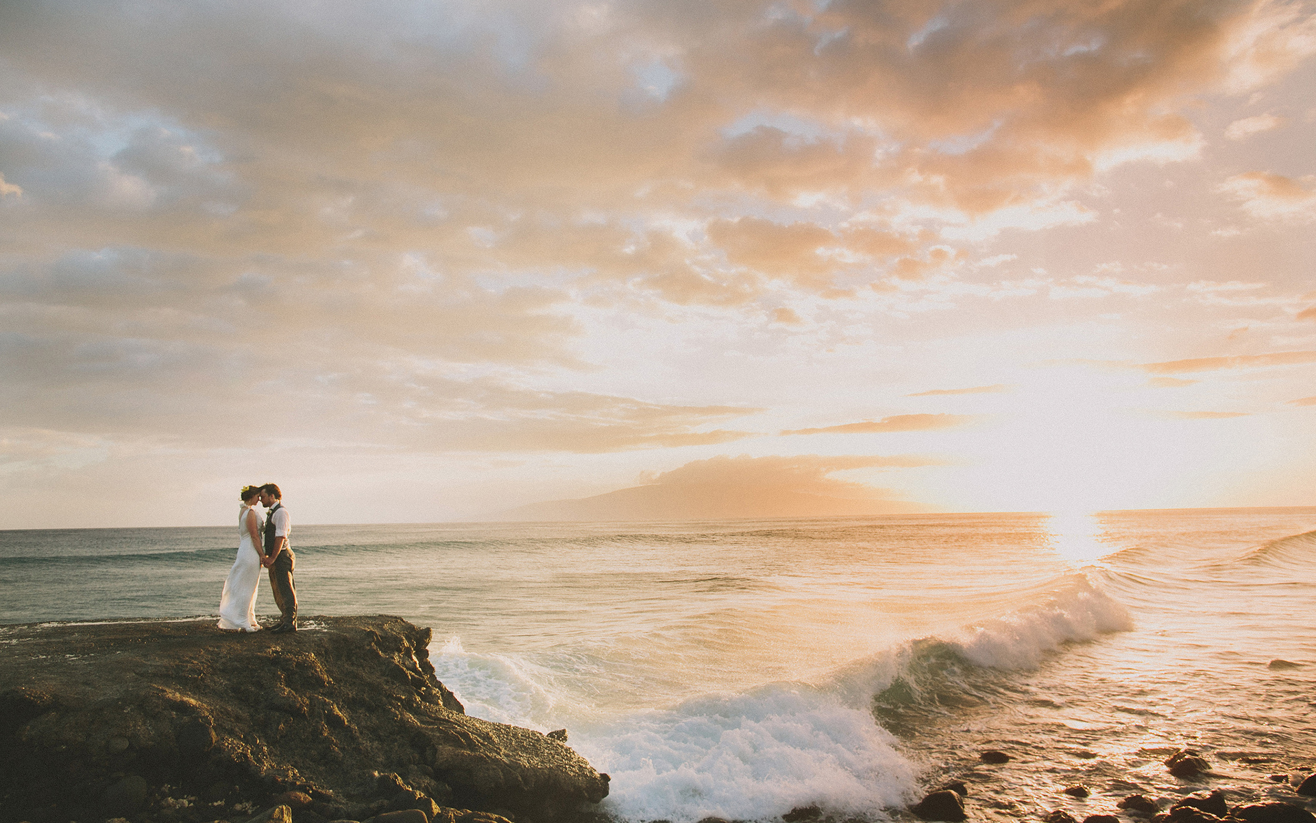 Description: A couple standing on a rock near the ocean at sunset with the sun setting behind them and the ocean crashing in.