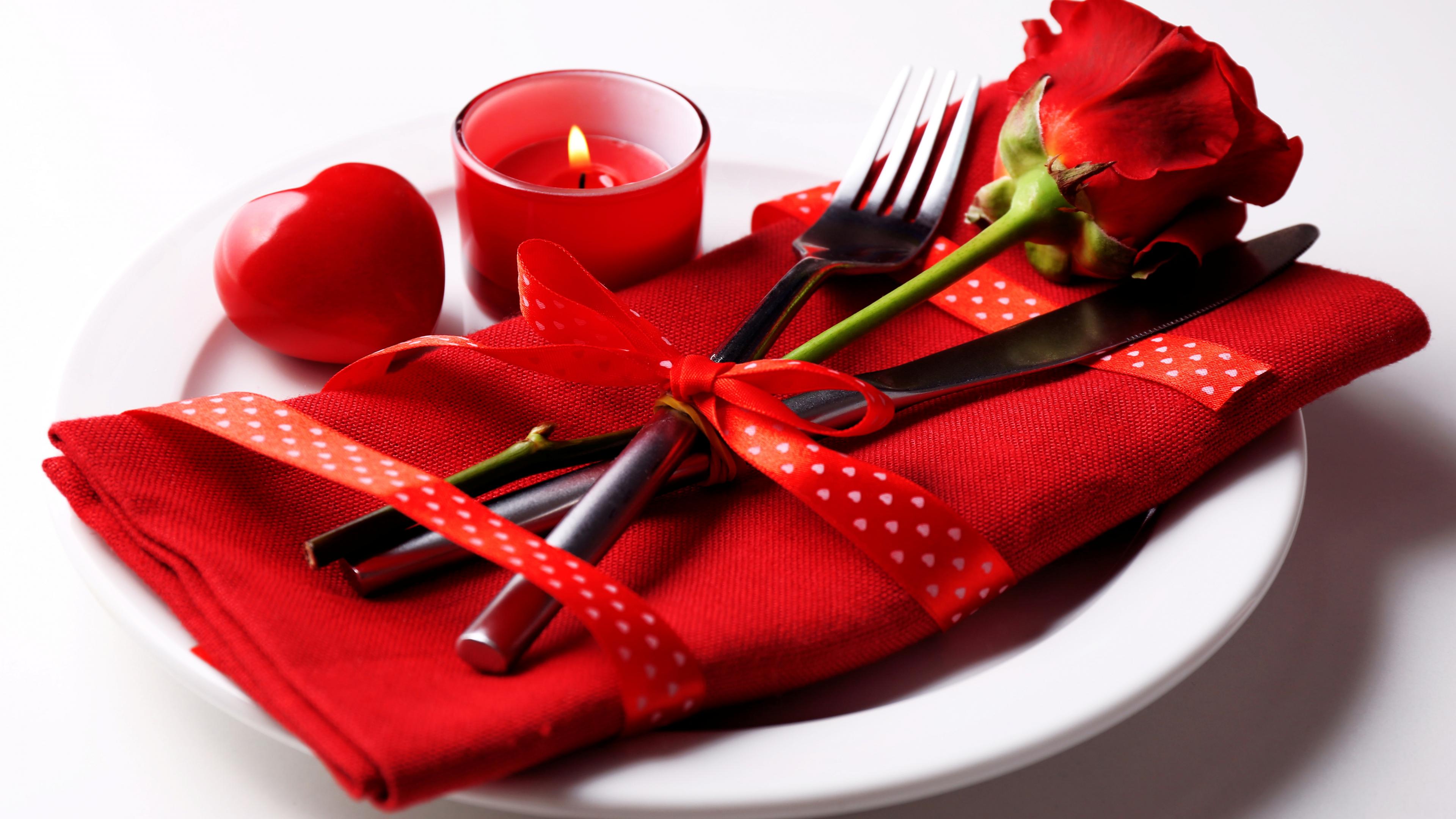 Description: A plate with a red napkin and a red rose on it with a red candle and a red napkin.