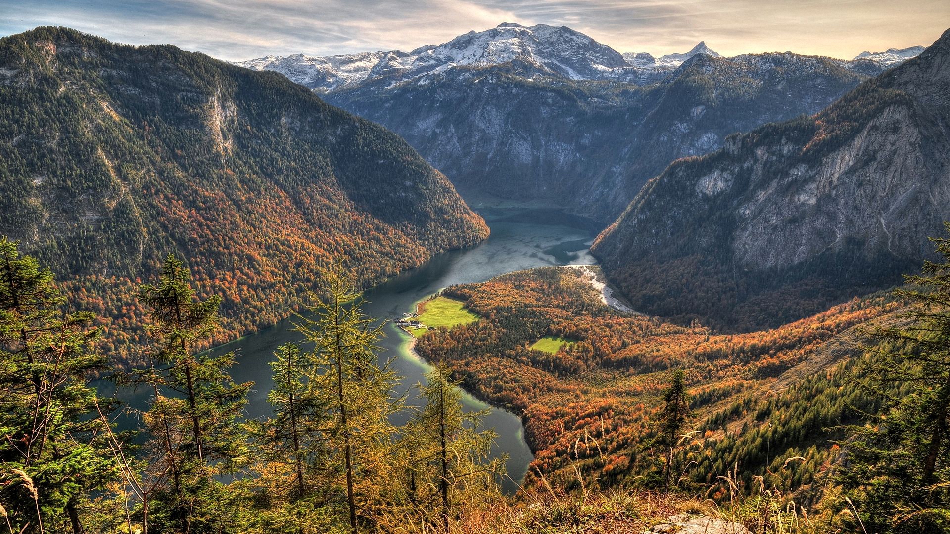 Description: A valley with a river surrounded by mountains and trees in the foreground.