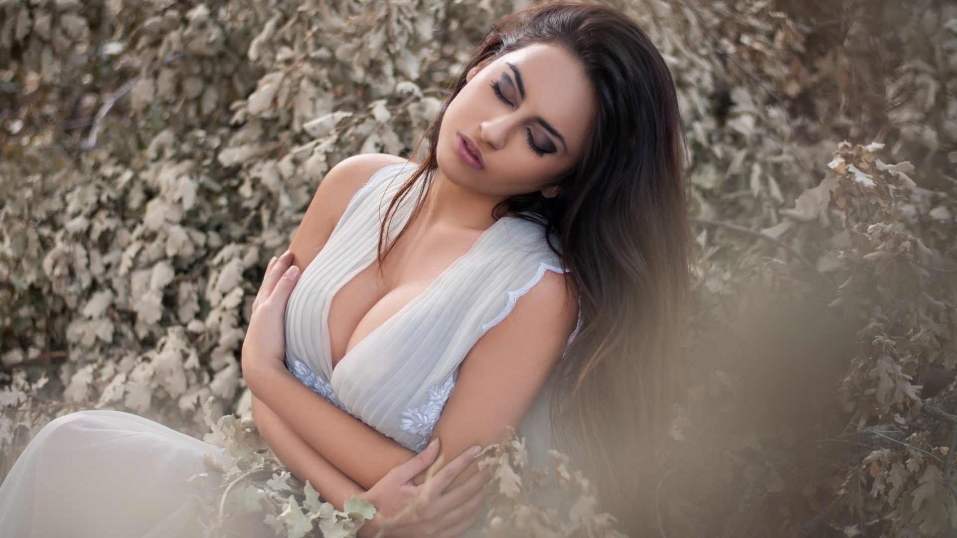 Description: A woman in a white dress posing for a picture in a field of flowers with her eyes closed and her arms crossed.