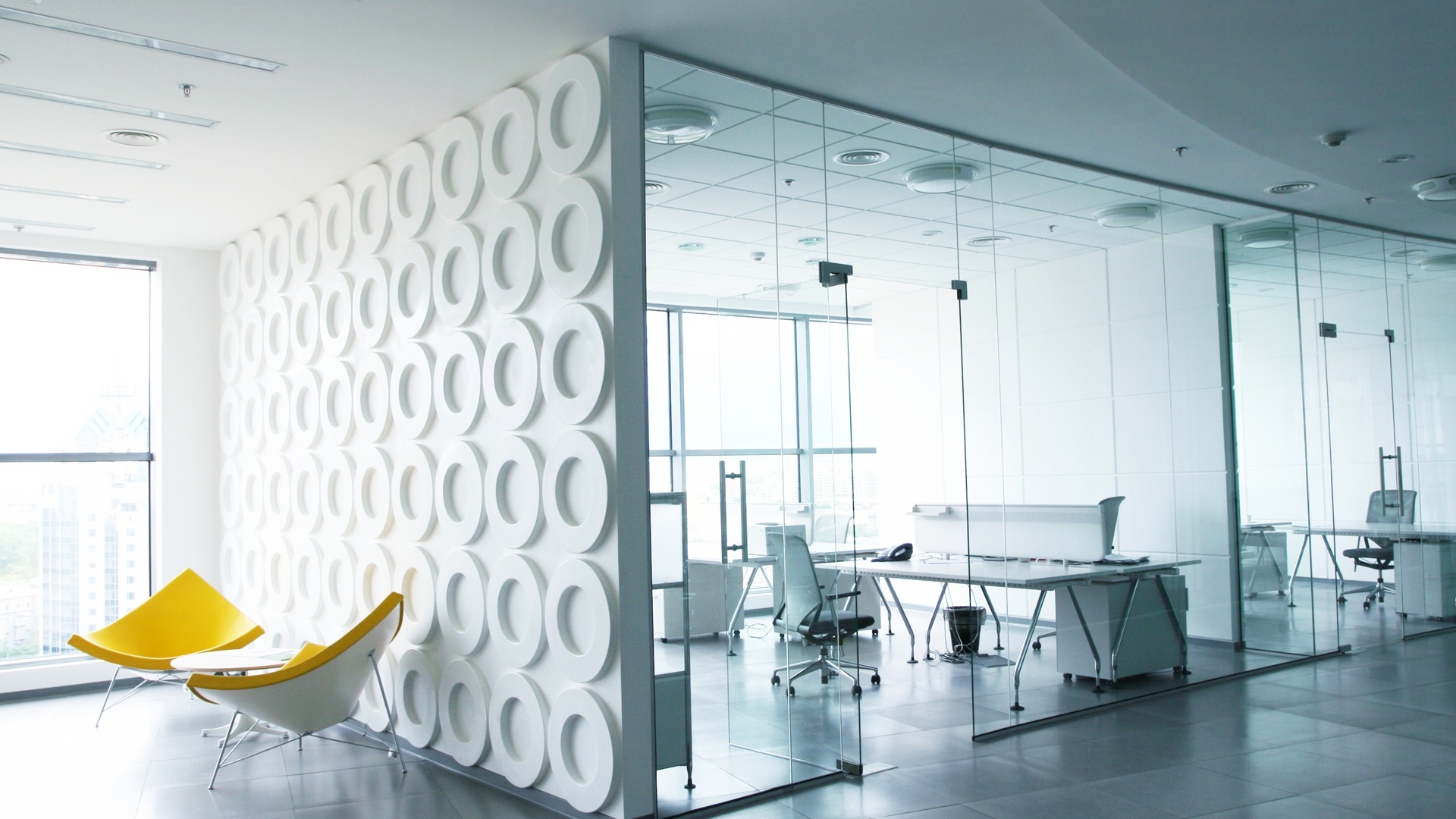 Description: A room with a chair and a table in it and a big window in the background with a view of a city.