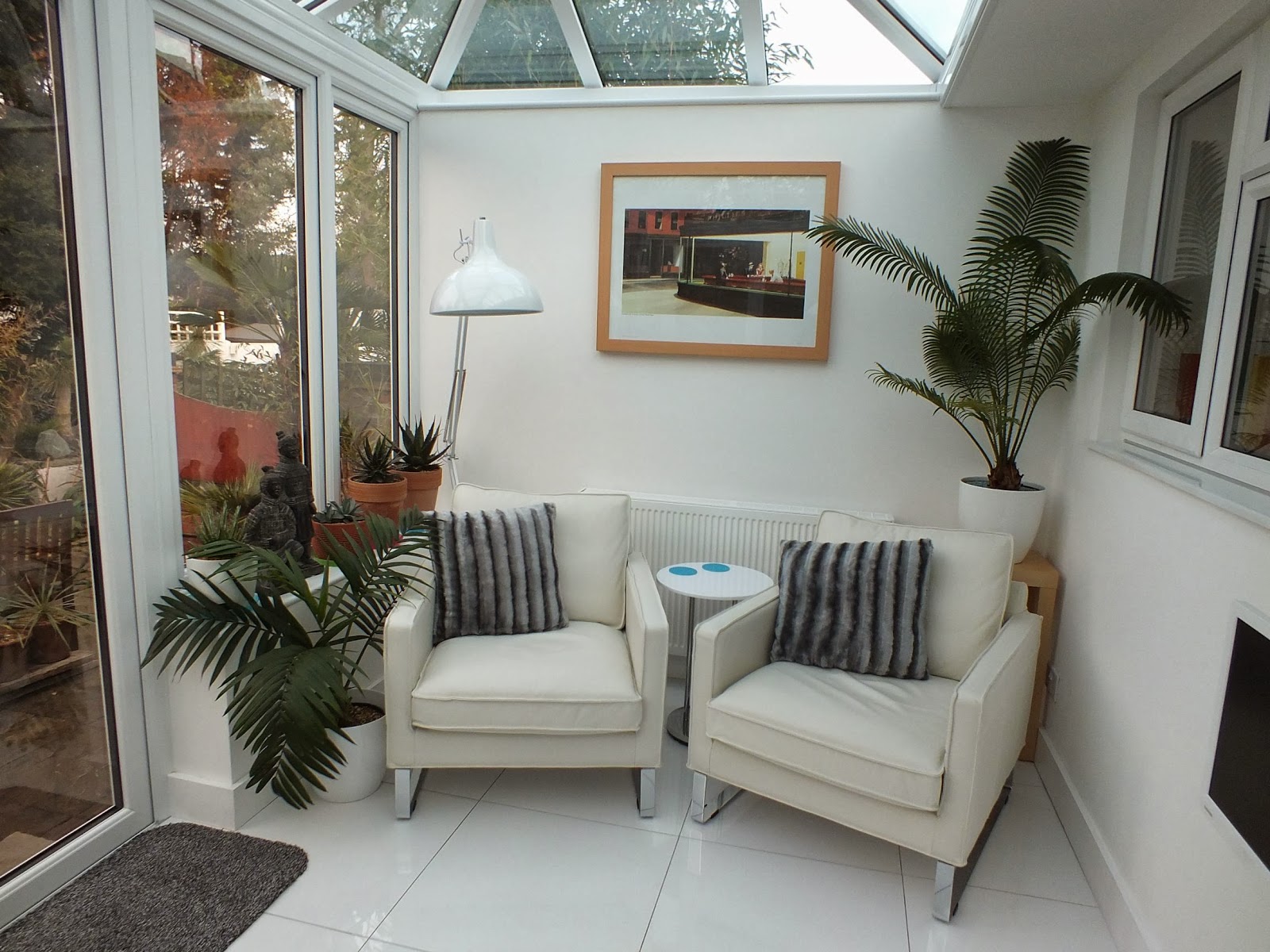 Description: A room with two chairs and a table with a plant on it and a picture on the wall above.
