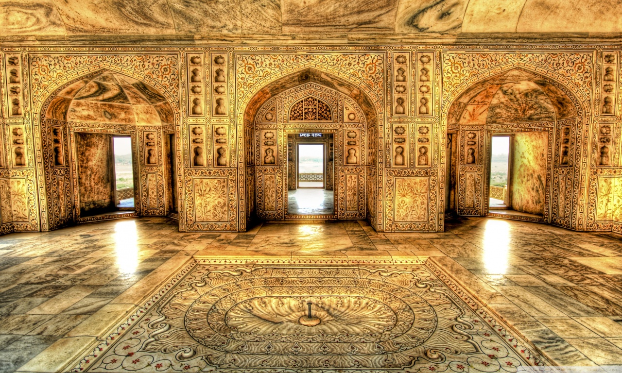Description: A room with a large rug and a doorway with a door leading to another room with a large window.