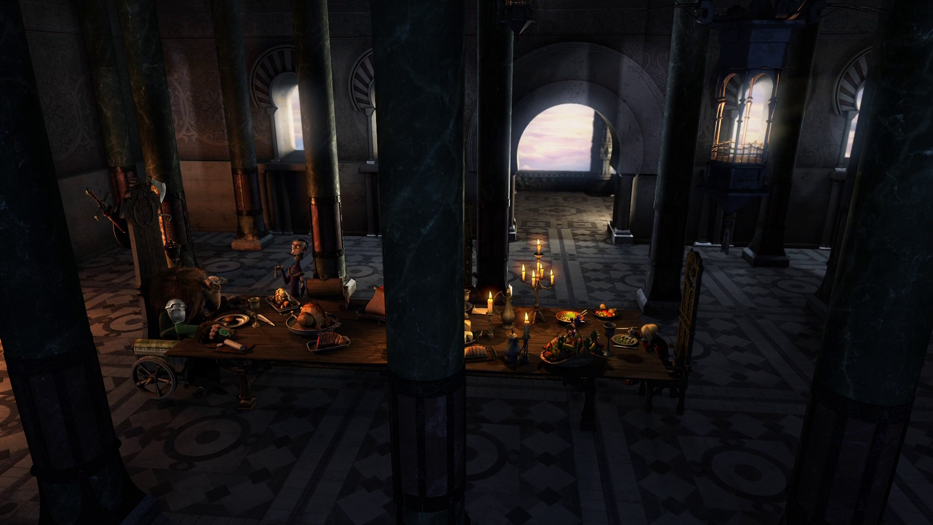 Description: A room with a table and candles in it and a window in the background with a view of a city.