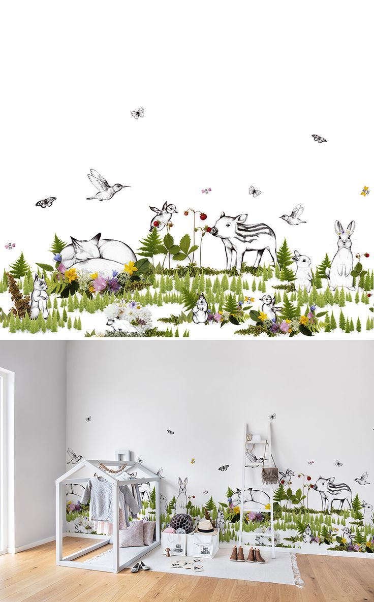 Description: A room with a wall mural of animals and plants on it and a picture of a room with a wall mural of animals and plants on it.