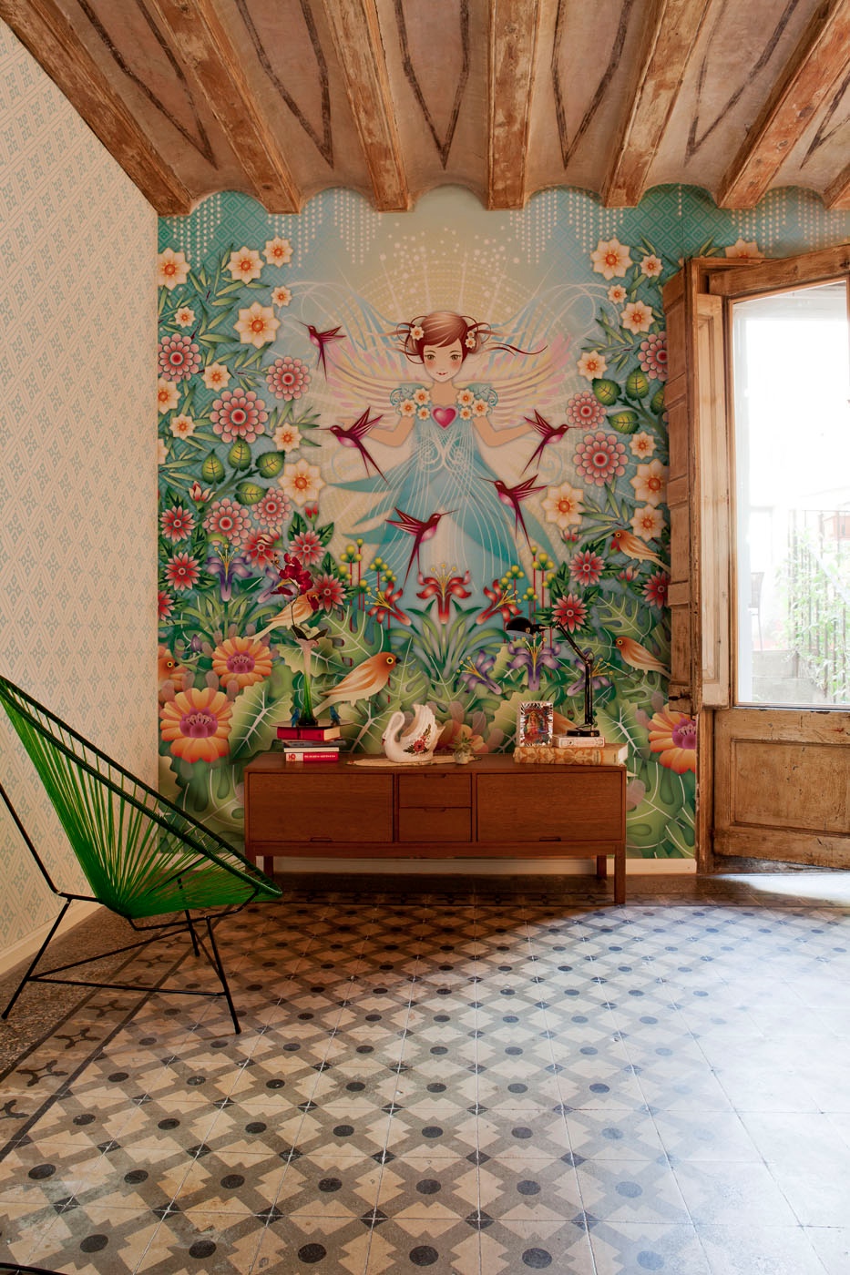 Description: A room with a wallpaper and a chair in it and a window in the background with a window.