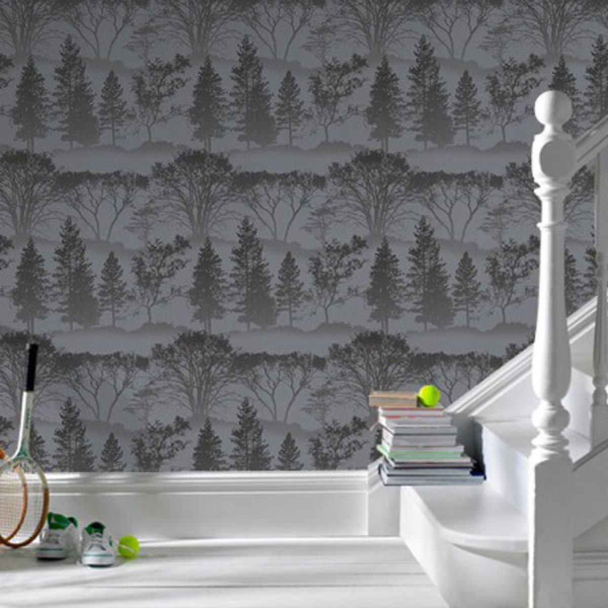 Description: A room with a wallpaper and a stair case with a tennis racket and ball on it and a tennis racket on the floor.