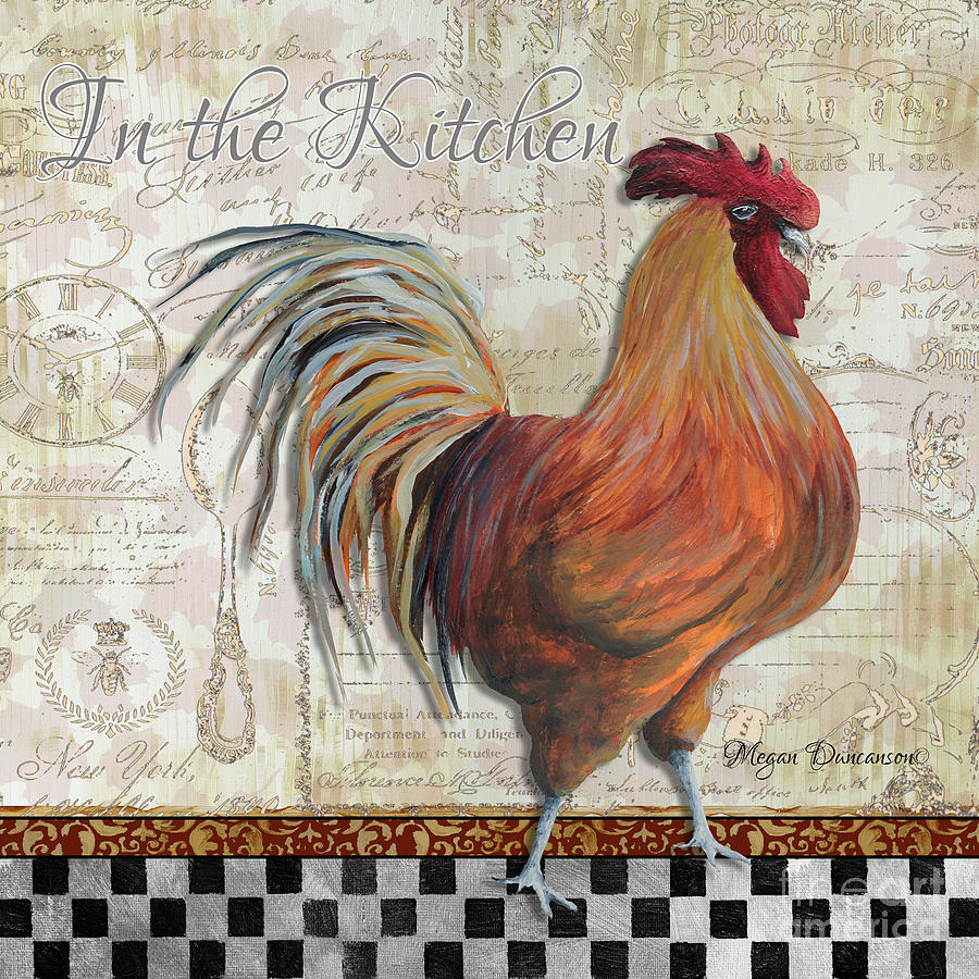 Description: A painting of a rooster on a checkered table cloth with the words in the kitchen written on it.