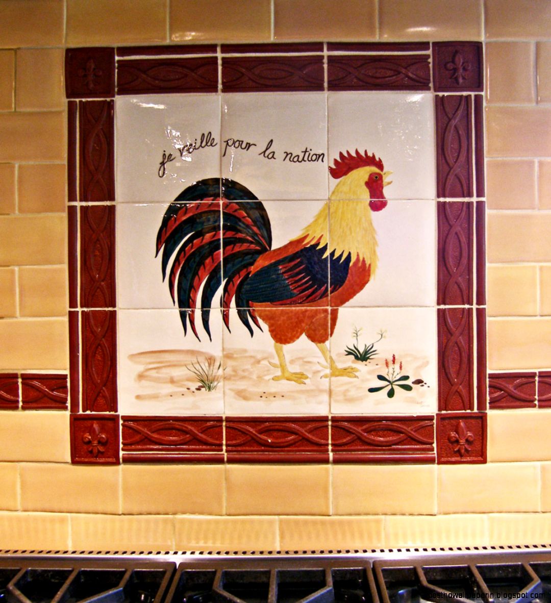 Description: A tile mural of a rooster on a wall in a kitchen with a stove top and a tile border.