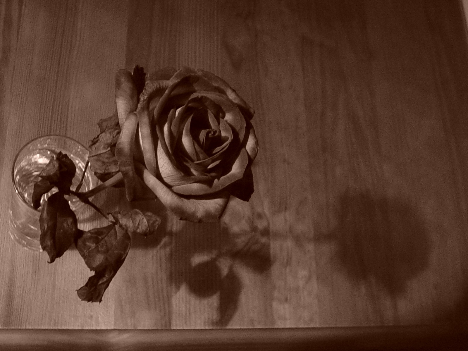 Description: A rose sitting on a table with a wine glass next to it and a rose in a vase on the table.