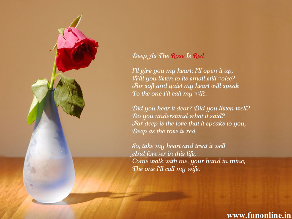 Description: A single rose in a vase with a poem written in it on a table top with a light brown background.
