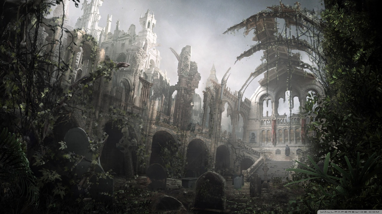 Description: A painting of a ruined building in a forest with a lot of trees and plants growing around it and a staircase leading up to the top of the building.