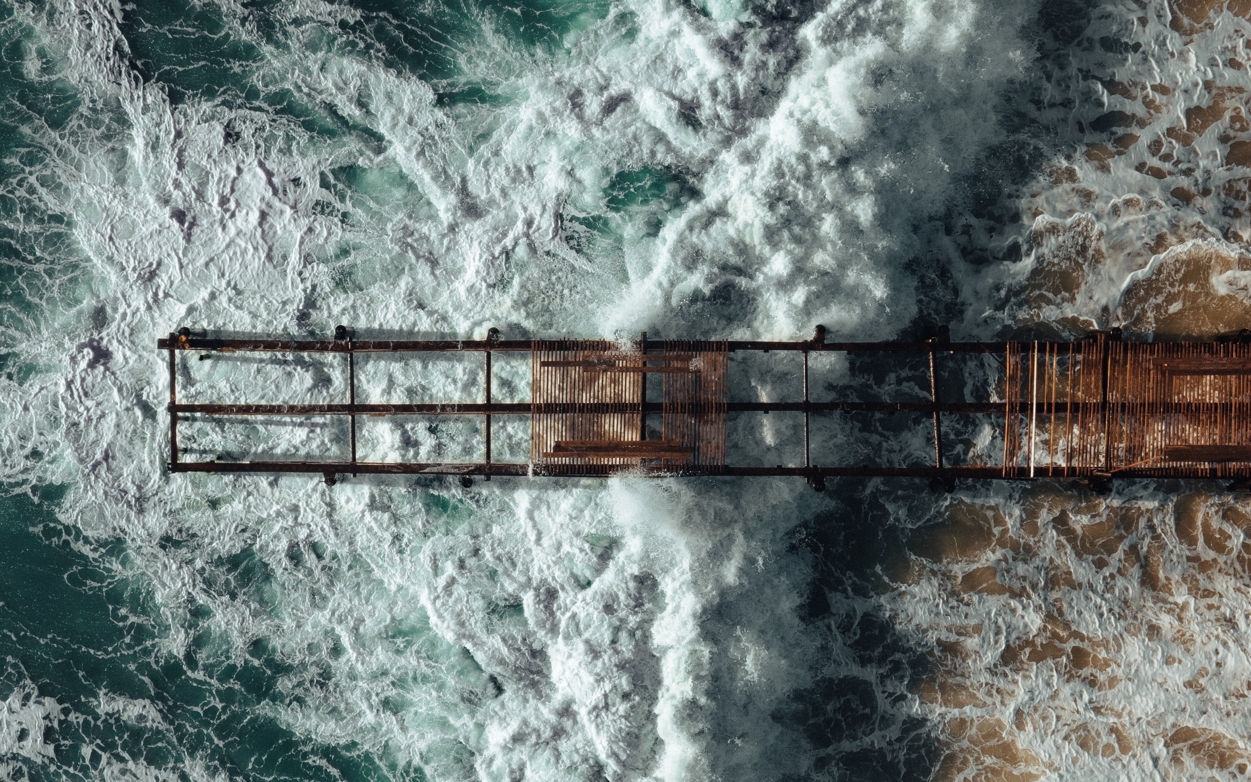 Description: A rusty pier in the middle of the ocean with waves crashing around it and a bird's eye view.