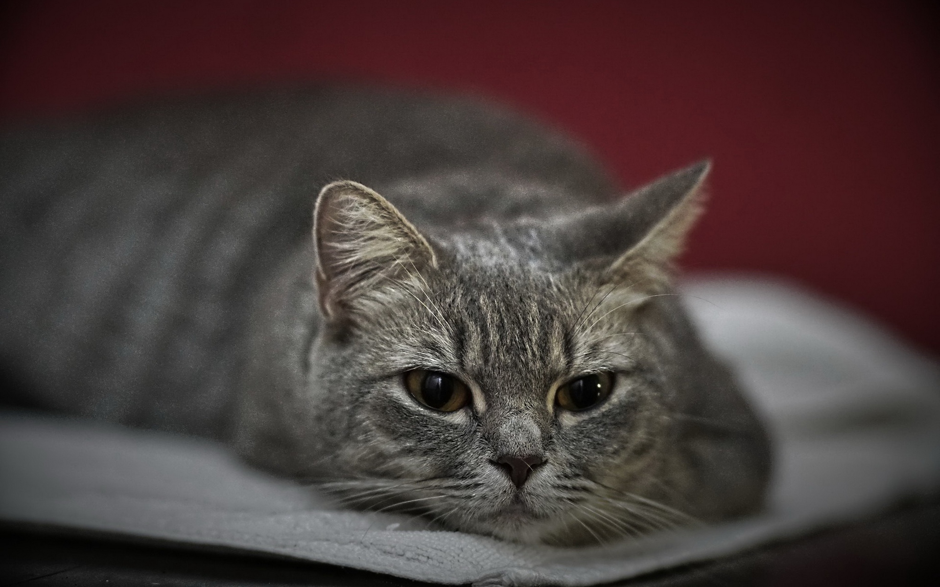 Description: A cat laying on a blanket looking at the camera with a sad look on its face and eyes.