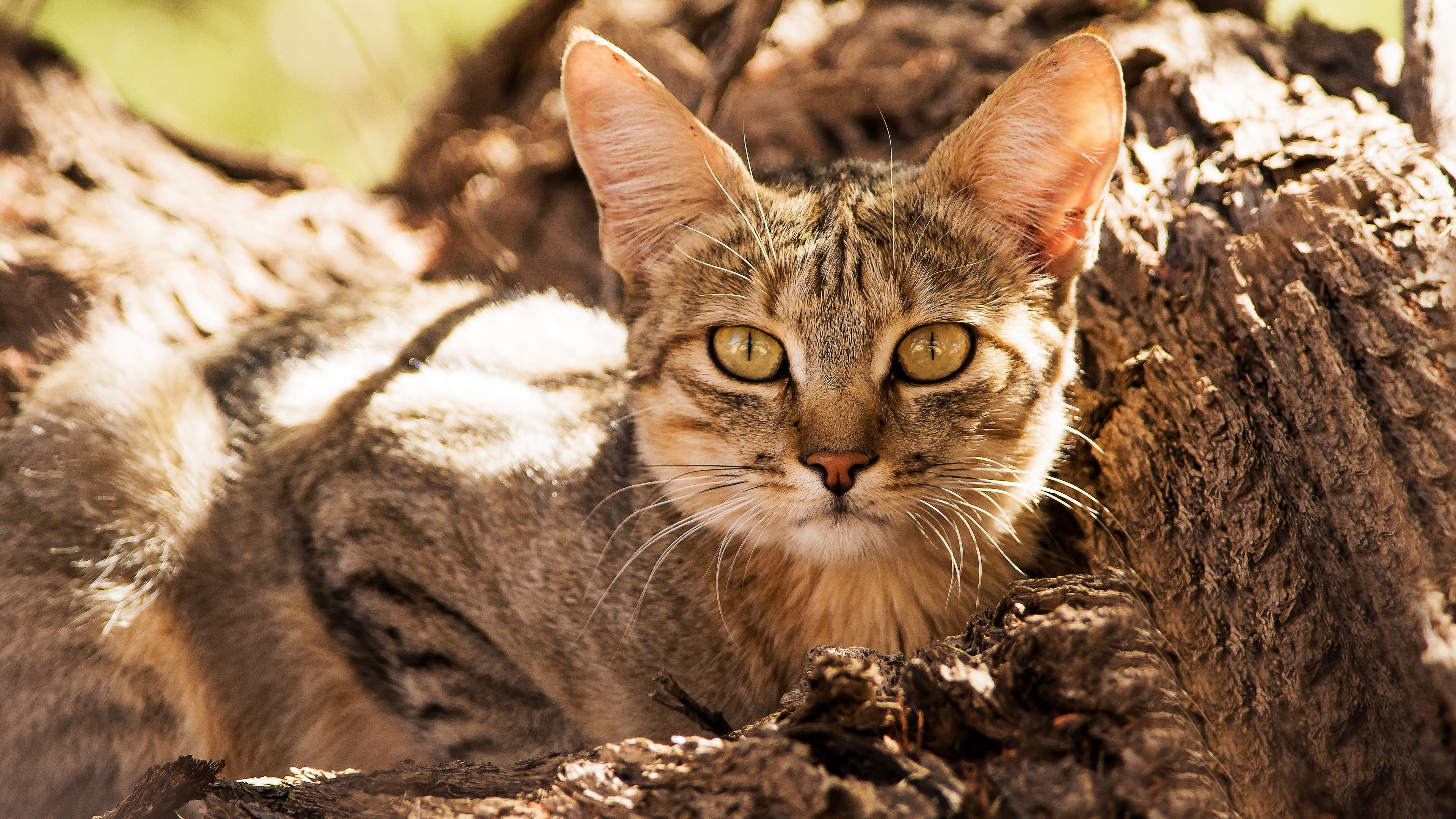 Description: A cat is sitting in the dirt near a tree stump and looking at the camera with a sad look on its face.