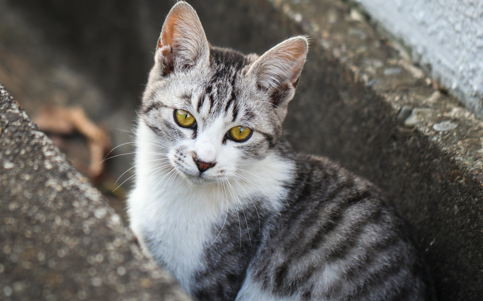 Description: A cat with yellow eyes sitting on a rock wall looking at the camera with a sad look on its face.