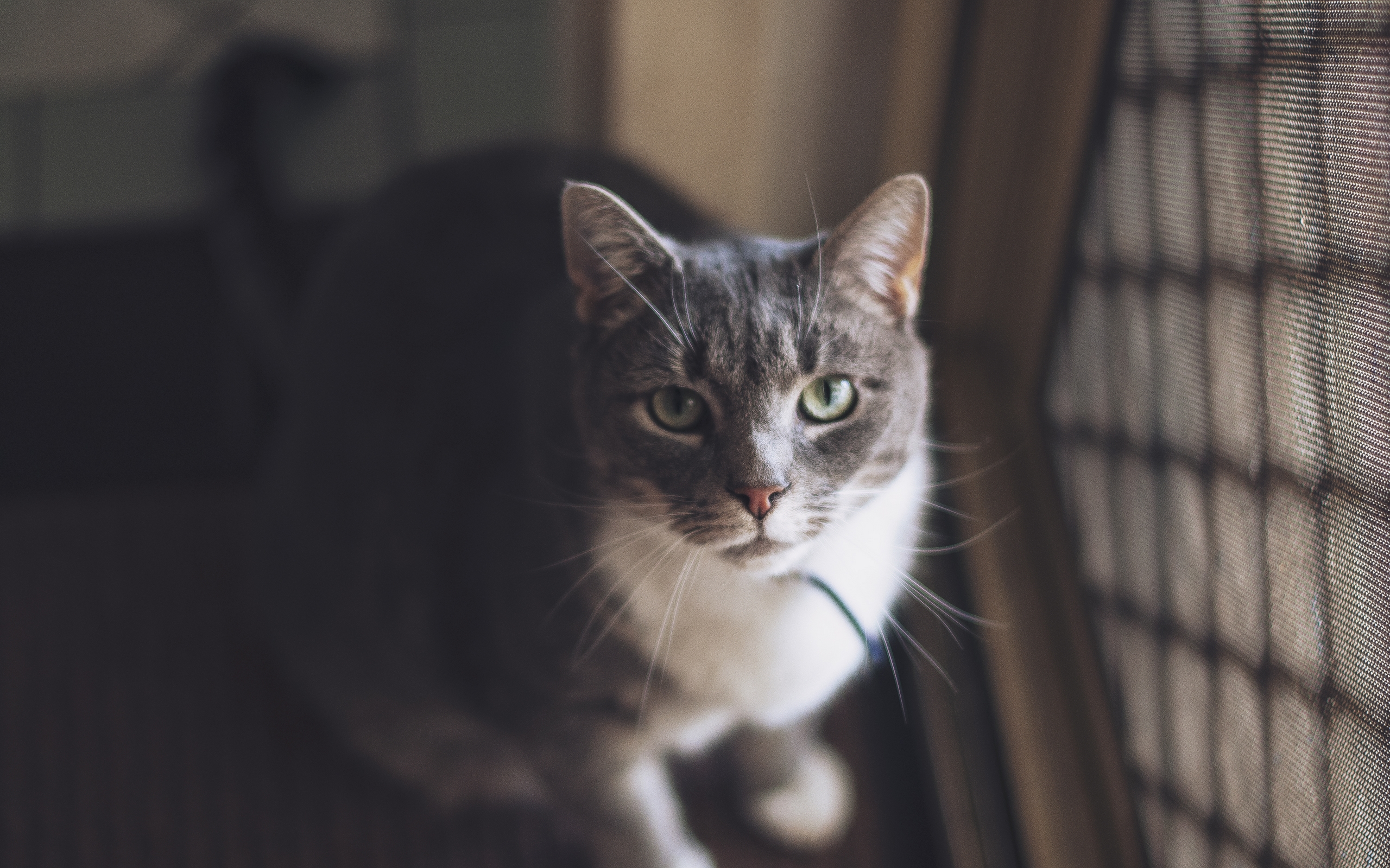 Description: A cat sitting on a floor next to a window sill looking at the camera with a sad look on its face.