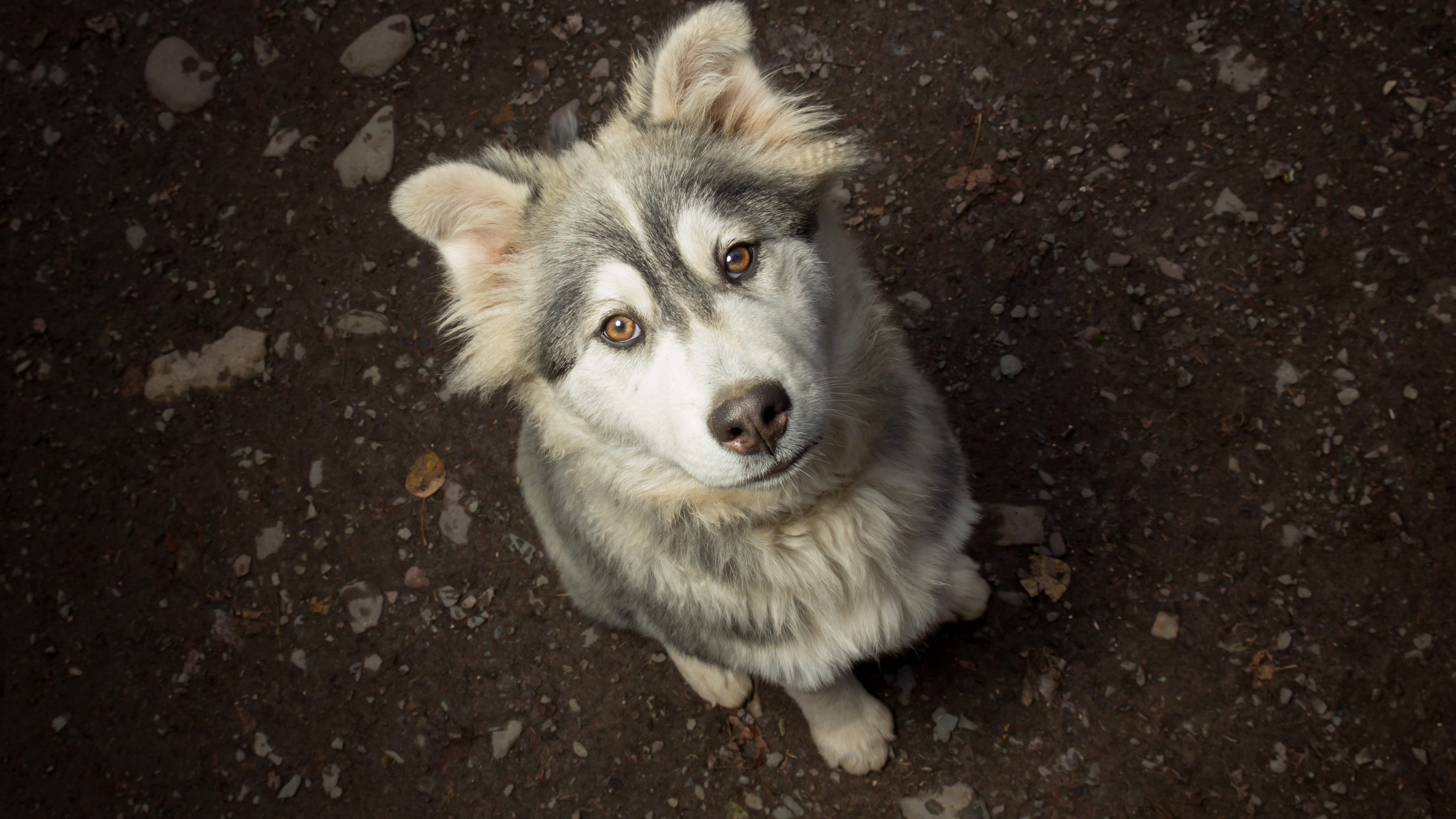 Description: A dog sitting on the ground looking up at the camera with a sad look on its face and eyes.