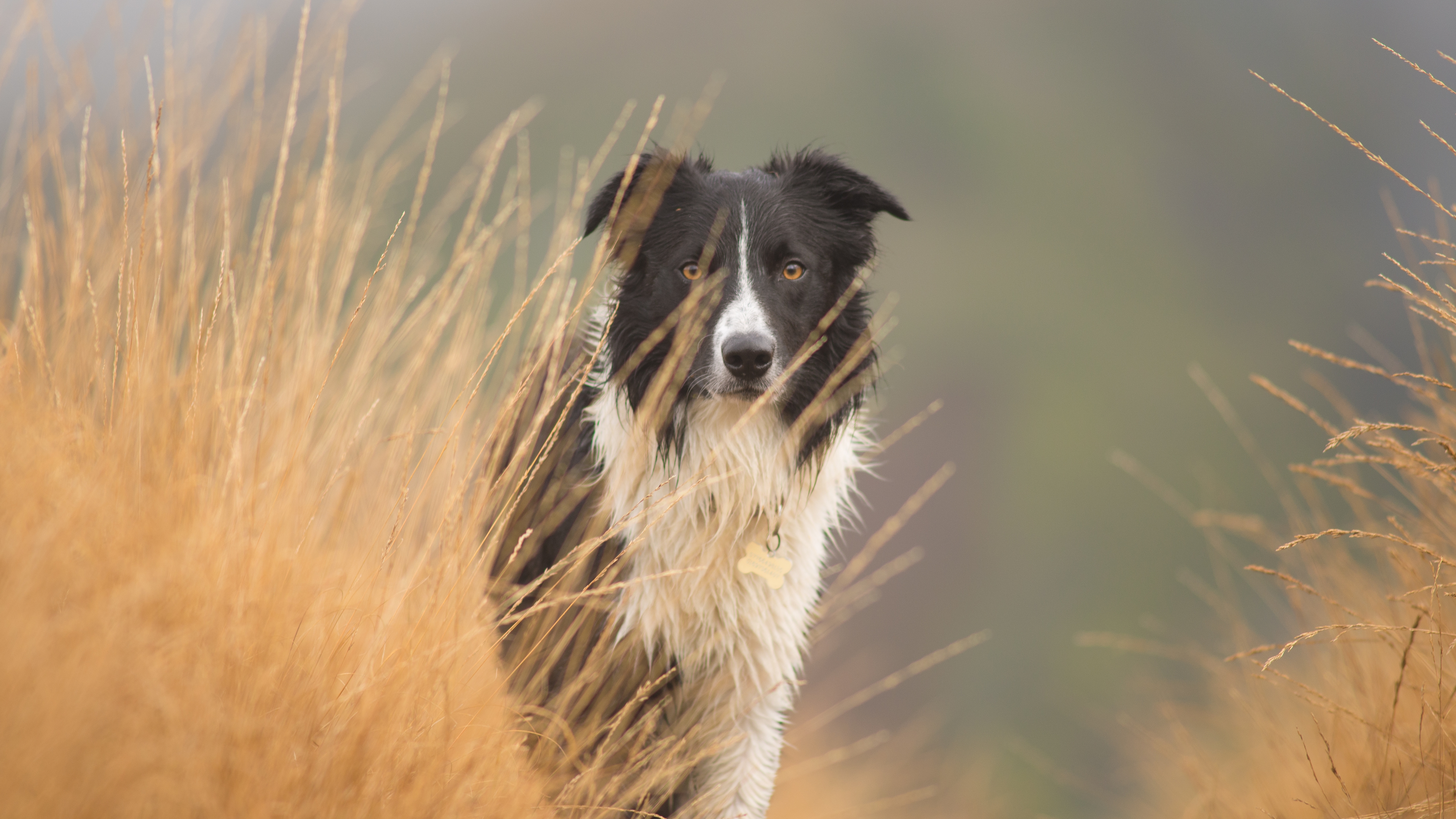 Description: A dog is standing in a field of tall grass and looking at the camera with a sad look on his face.