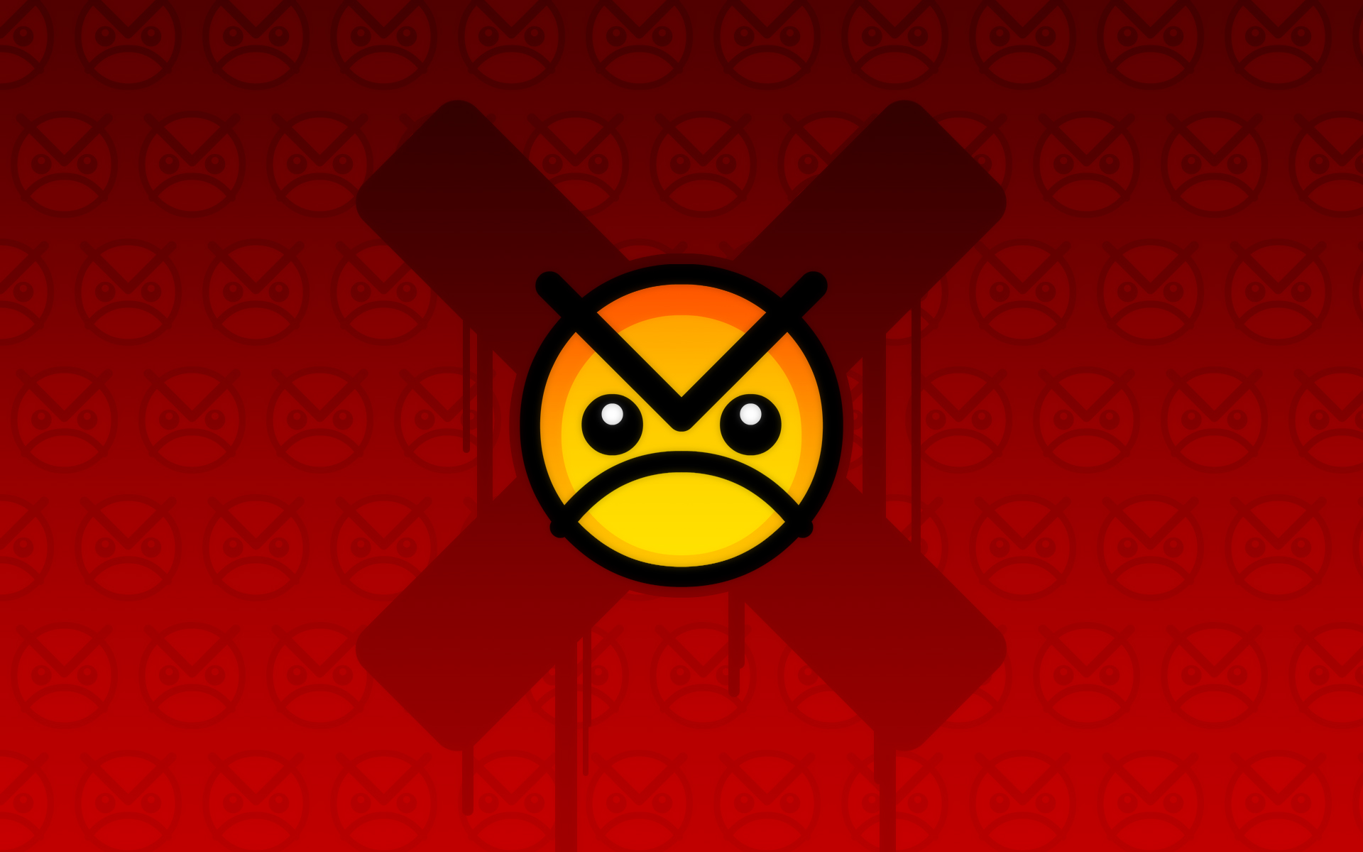 Description: A sad face with a crossed out cross on it's chest and a red background with a pattern.