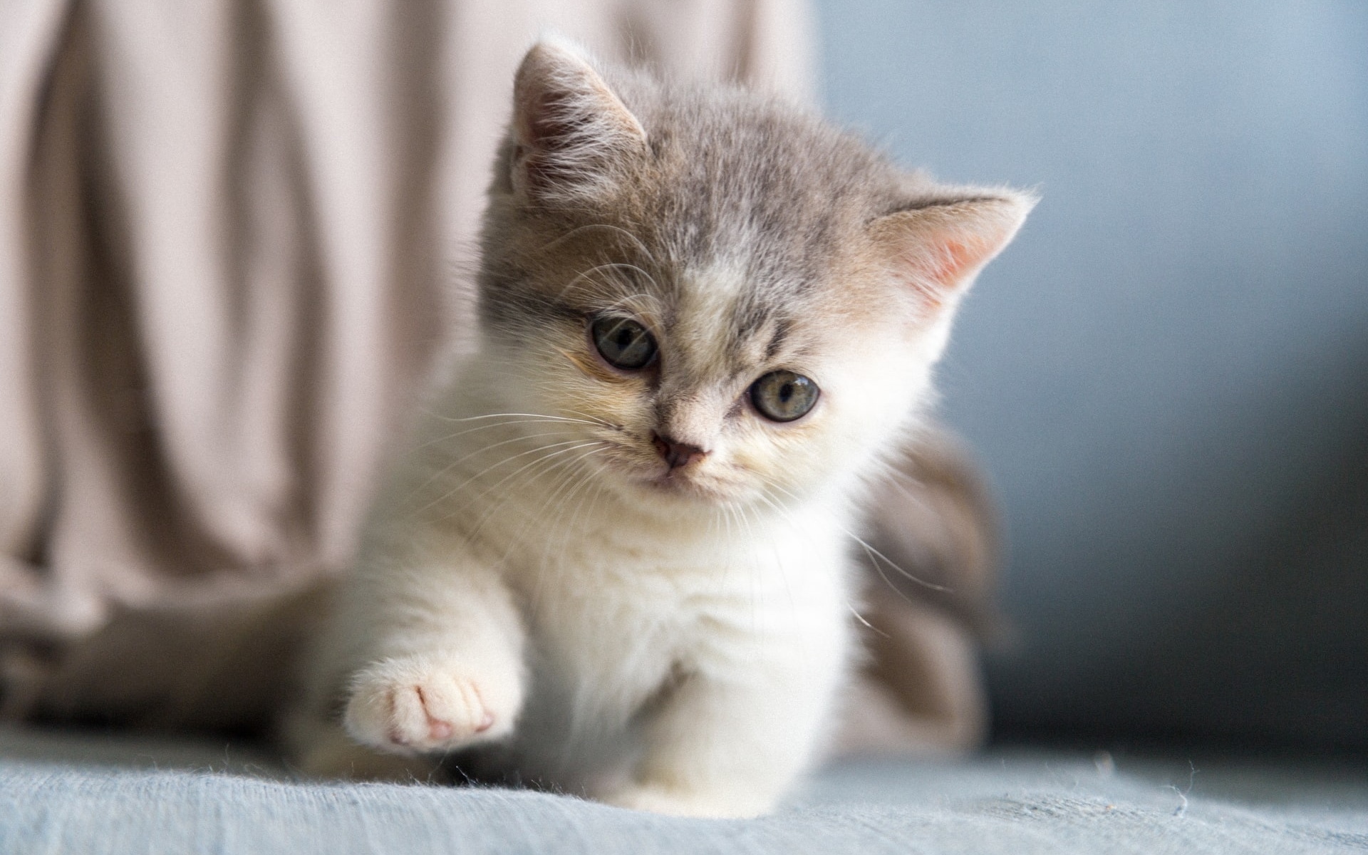Description: A small kitten is sitting on a couch and looking at the camera with a sad look on its face.