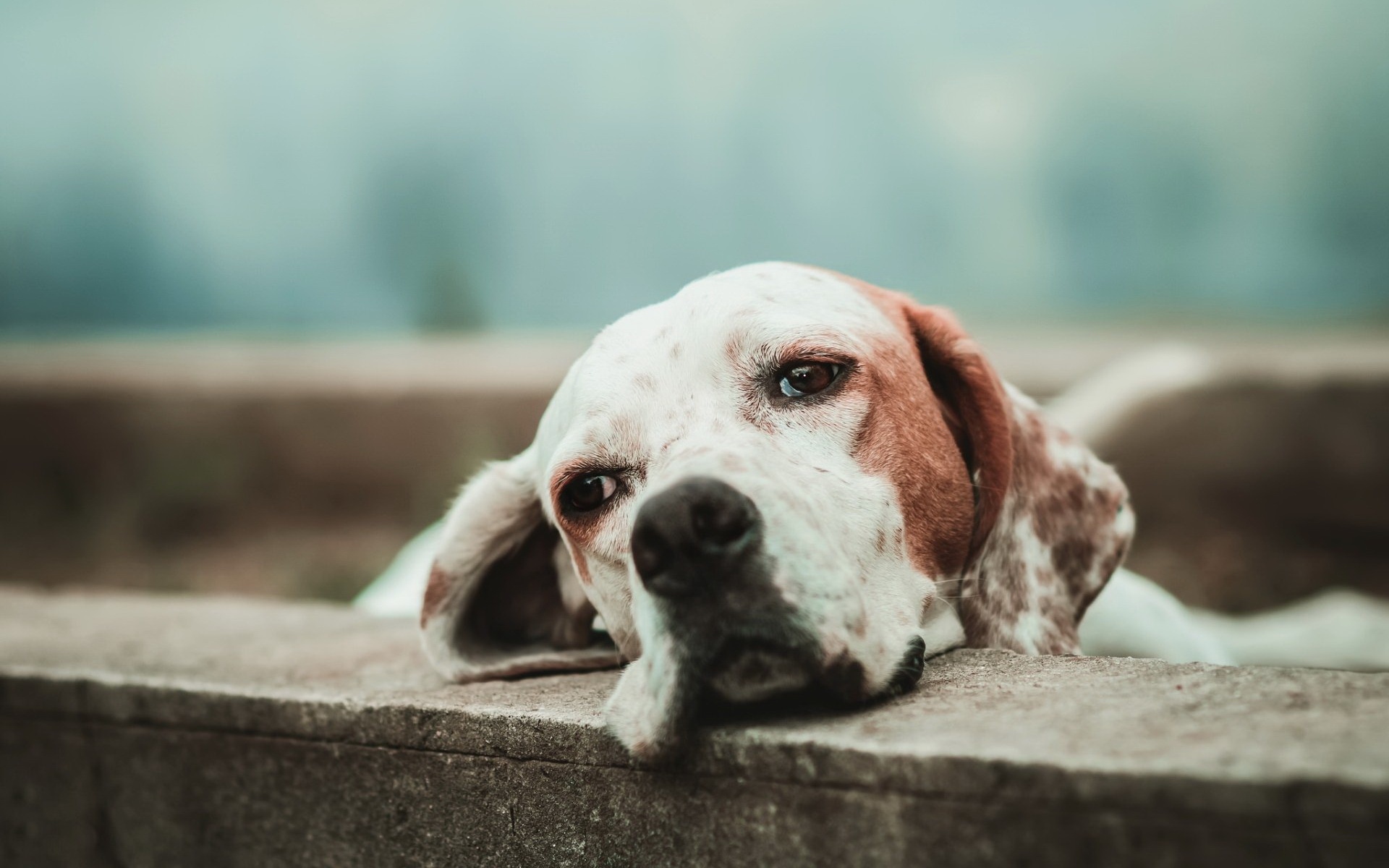 Description: A dog is laying down on a ledge looking at the camera with a sad look on his face and eyes.
