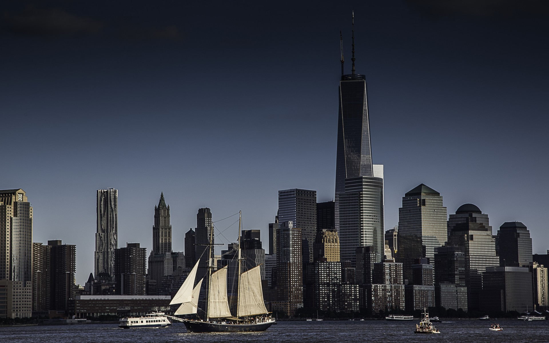Description: A sailboat in the water near a city skyline with a tall building in the background and a boat in the water.