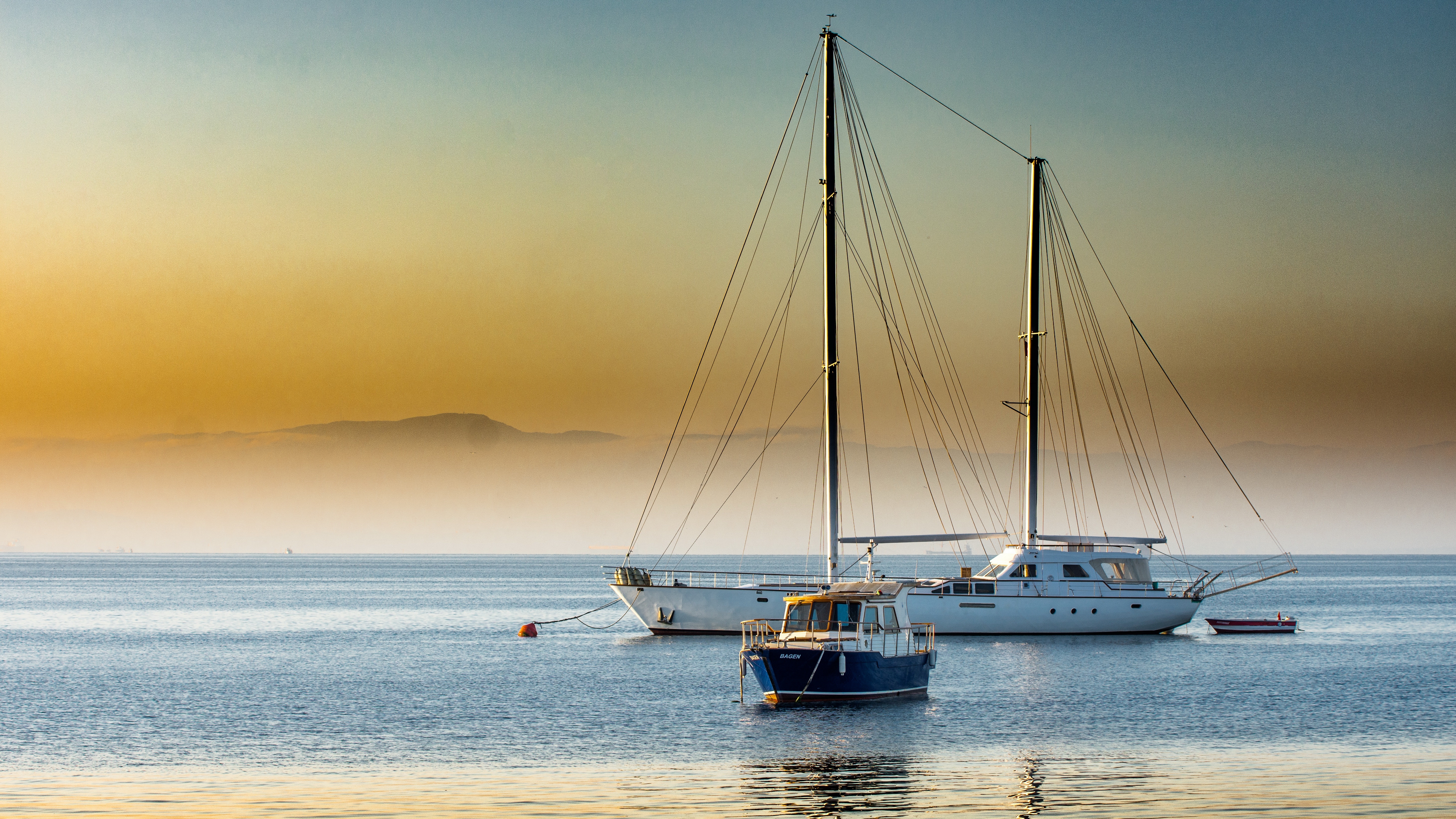 Description: A sailboat is docked in the water at sunset or dawn with a mountain in the background and fog in the sky.