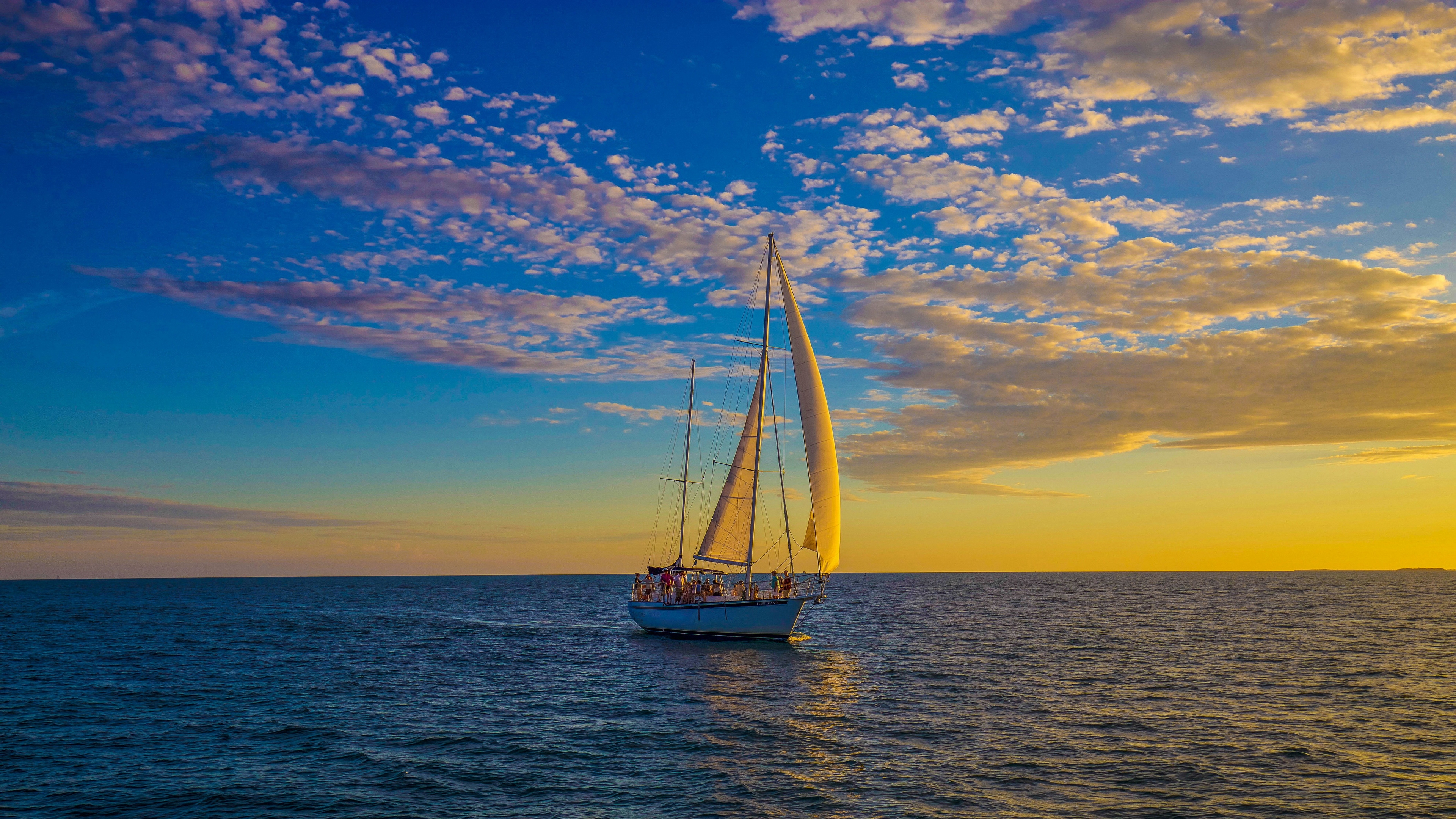 Description: A sailboat sailing on the ocean at sunset with clouds in the sky above it and a few people on the deck.