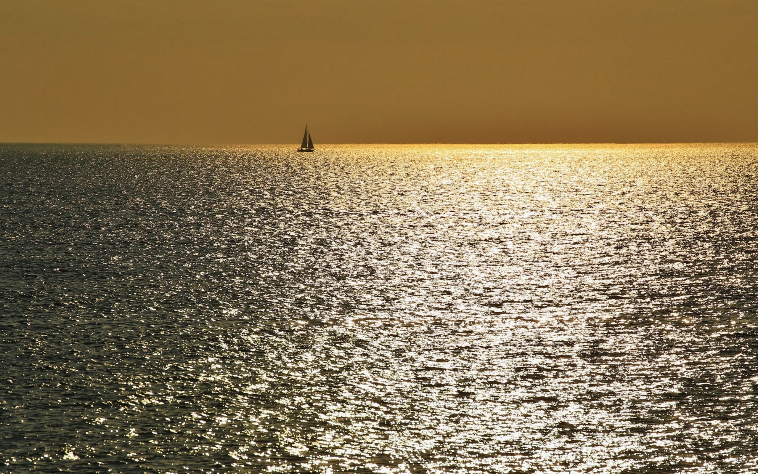 Description: A sailboat is sailing across the ocean at sunset or dawn.
