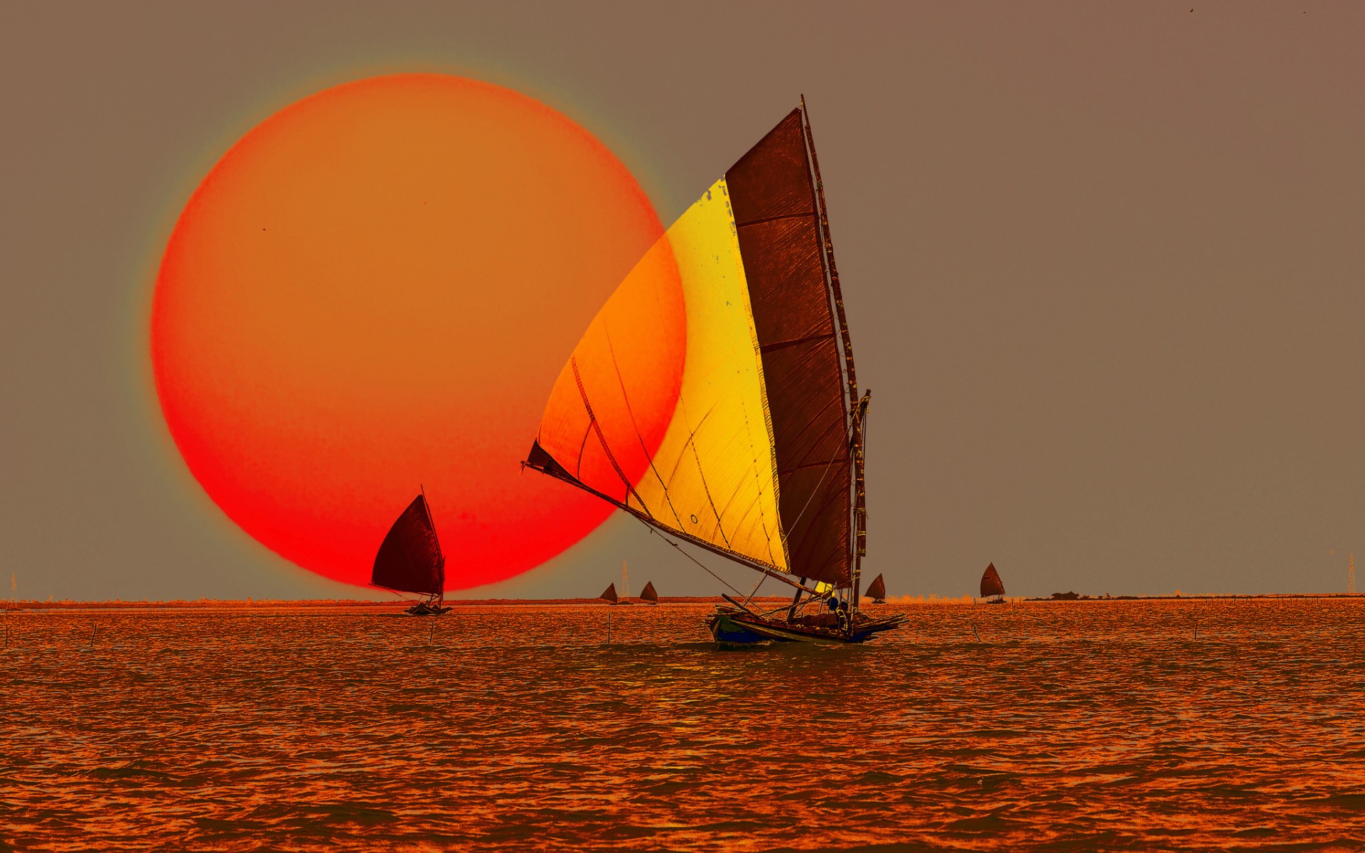 Description: A sailboat with a yellow and red sail is in the ocean with a large sun in the background.