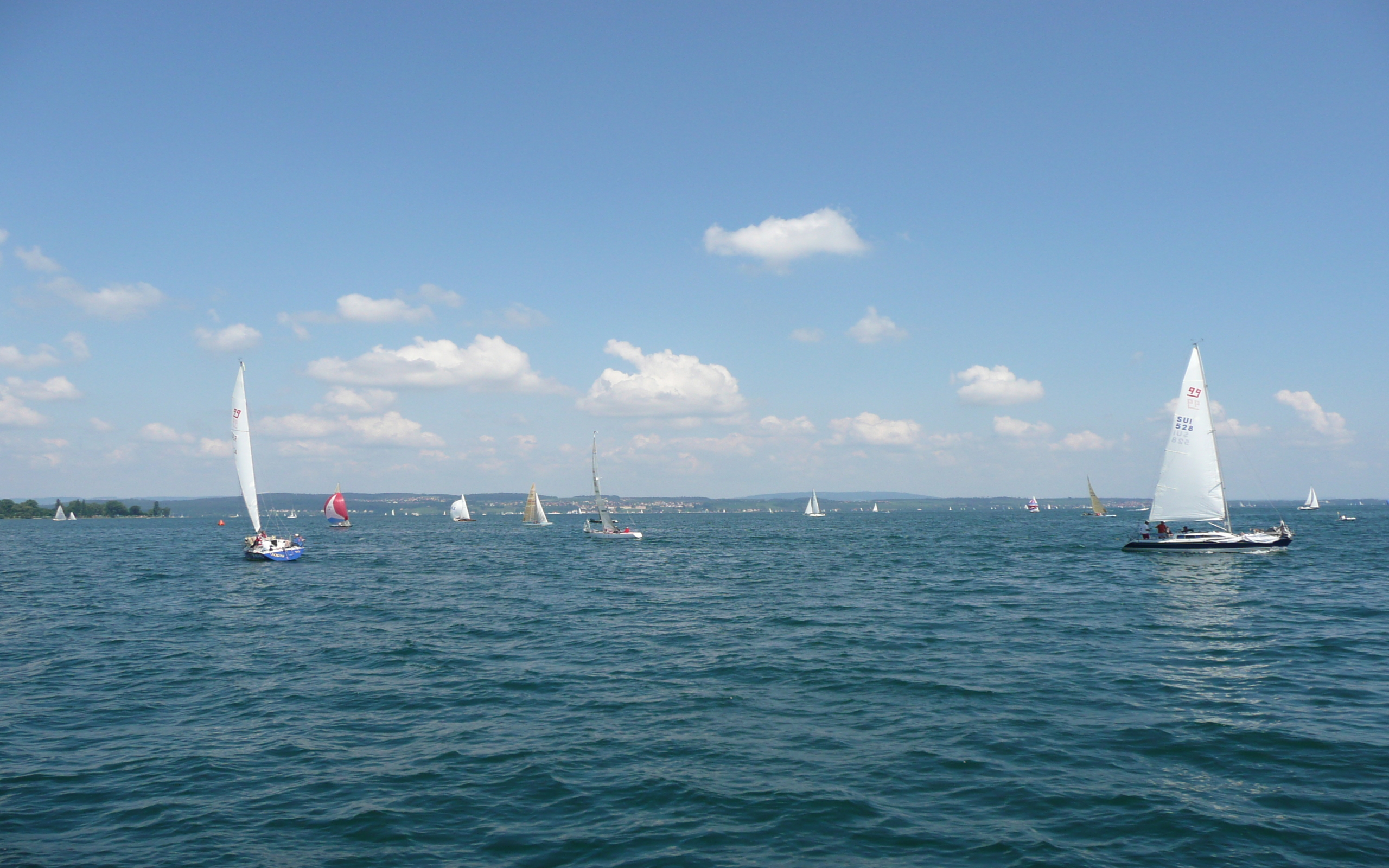 Description: A group of sailboats sailing on a large body of water under a blue sky with clouds in the background.