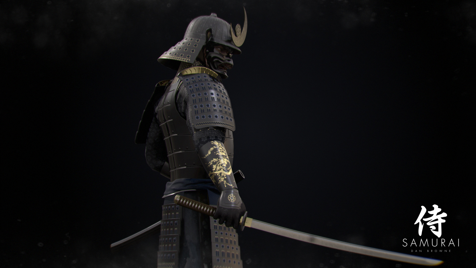 Description: A samurai with a sword in his hand and a helmet on his head and a sword in his hand.