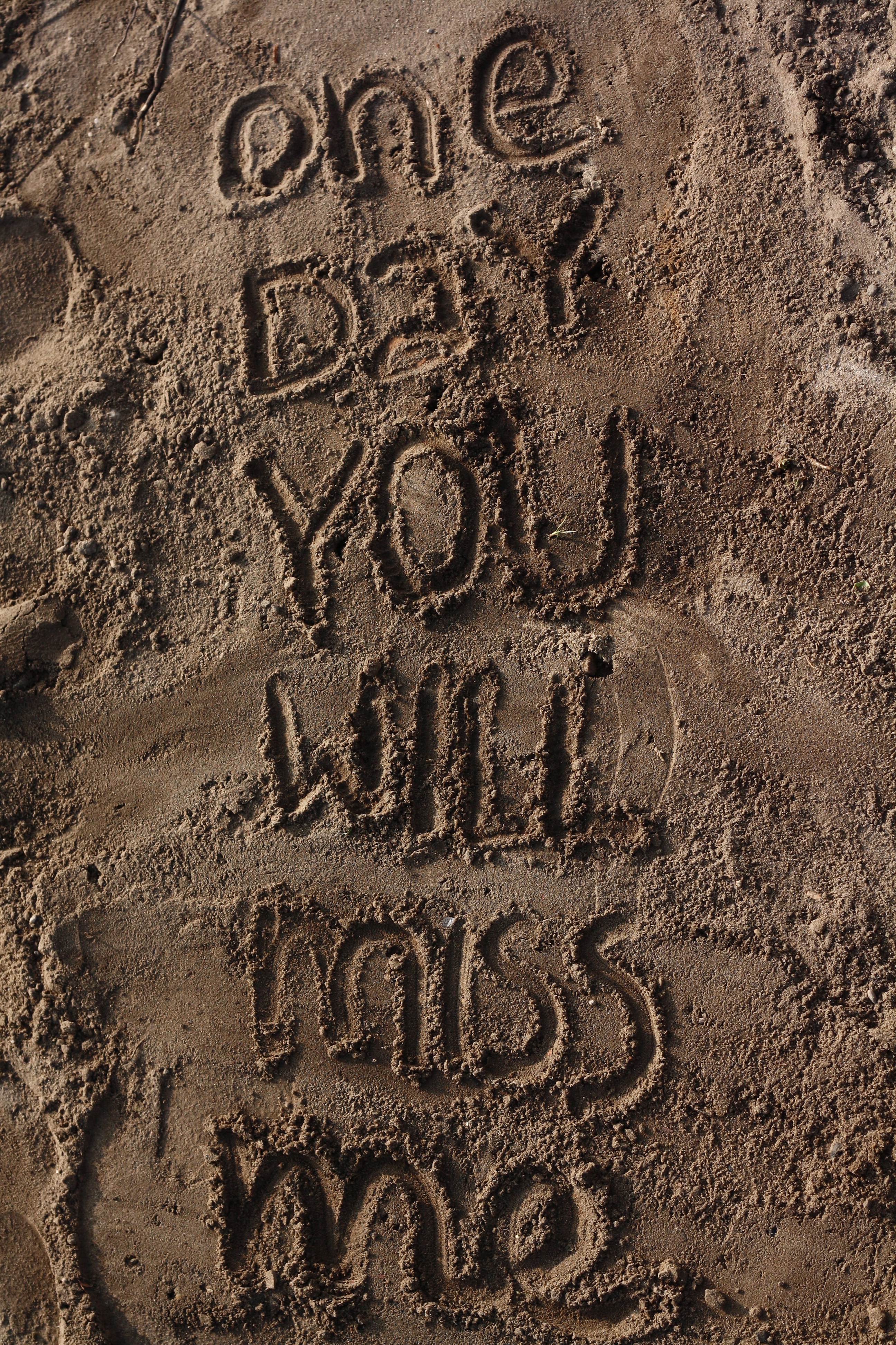 Description: A picture of a sand message written in the sand with a dog and a cat on it that says.