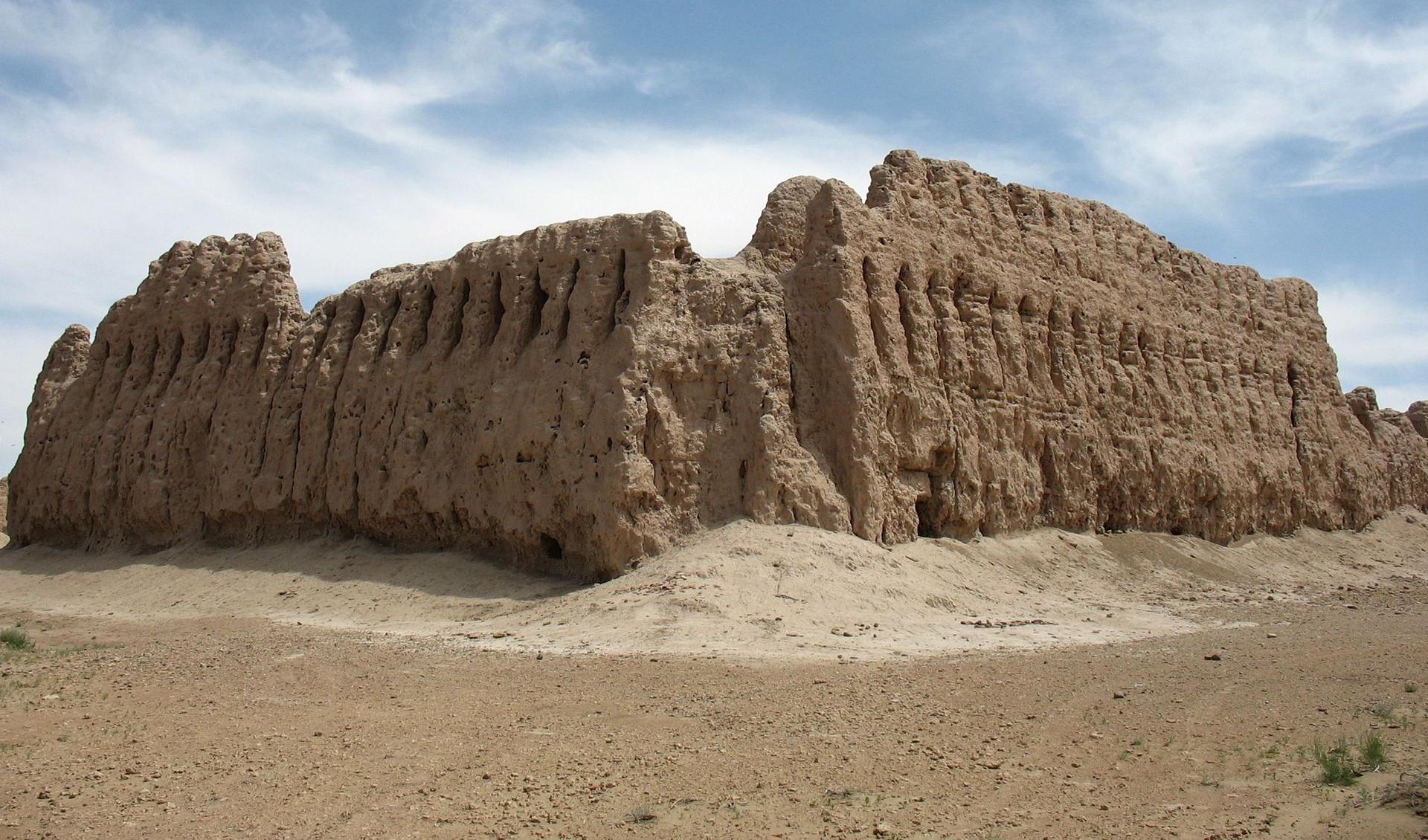 Description: A large sand castle made of rocks in the desert with a sky background and clouds in the background.