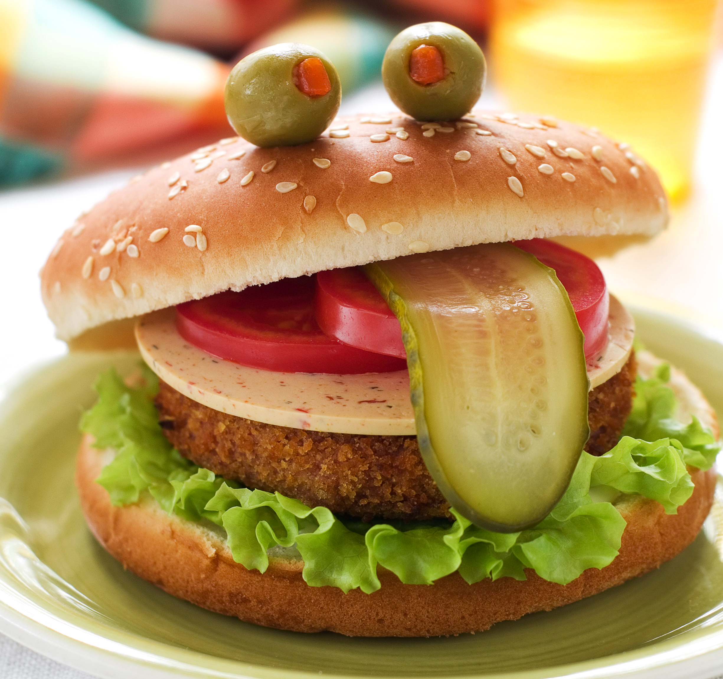 Description: A sandwich with pickles and tomatoes on a bun with lettuce and tomato slices on top of it.