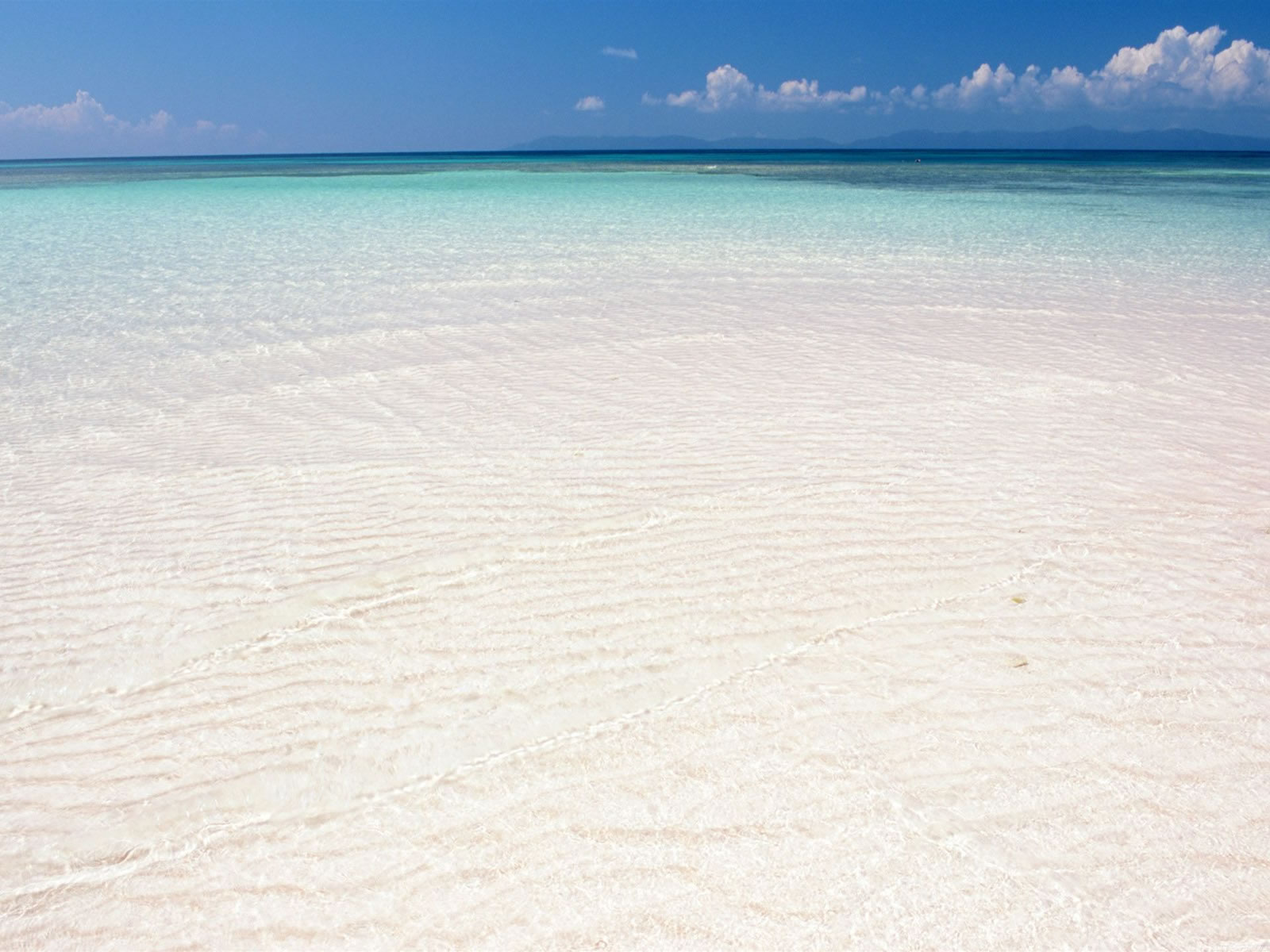 Description: A sandy beach with a blue sky and clouds in the background and a lone boat in the water at the bottom.