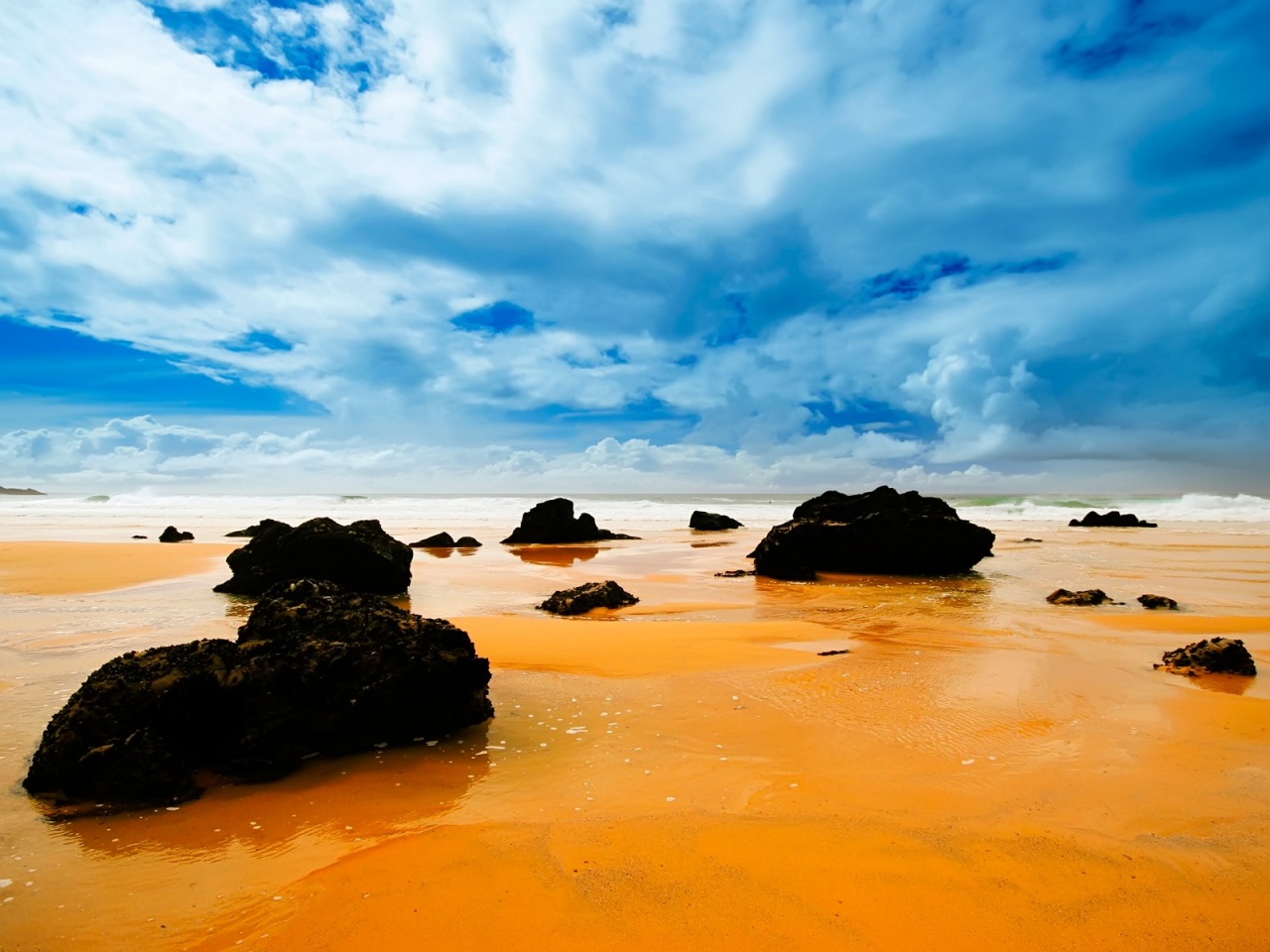 Description: A sandy beach with rocks and water under a cloudy sky with clouds above it and a blue sky above.