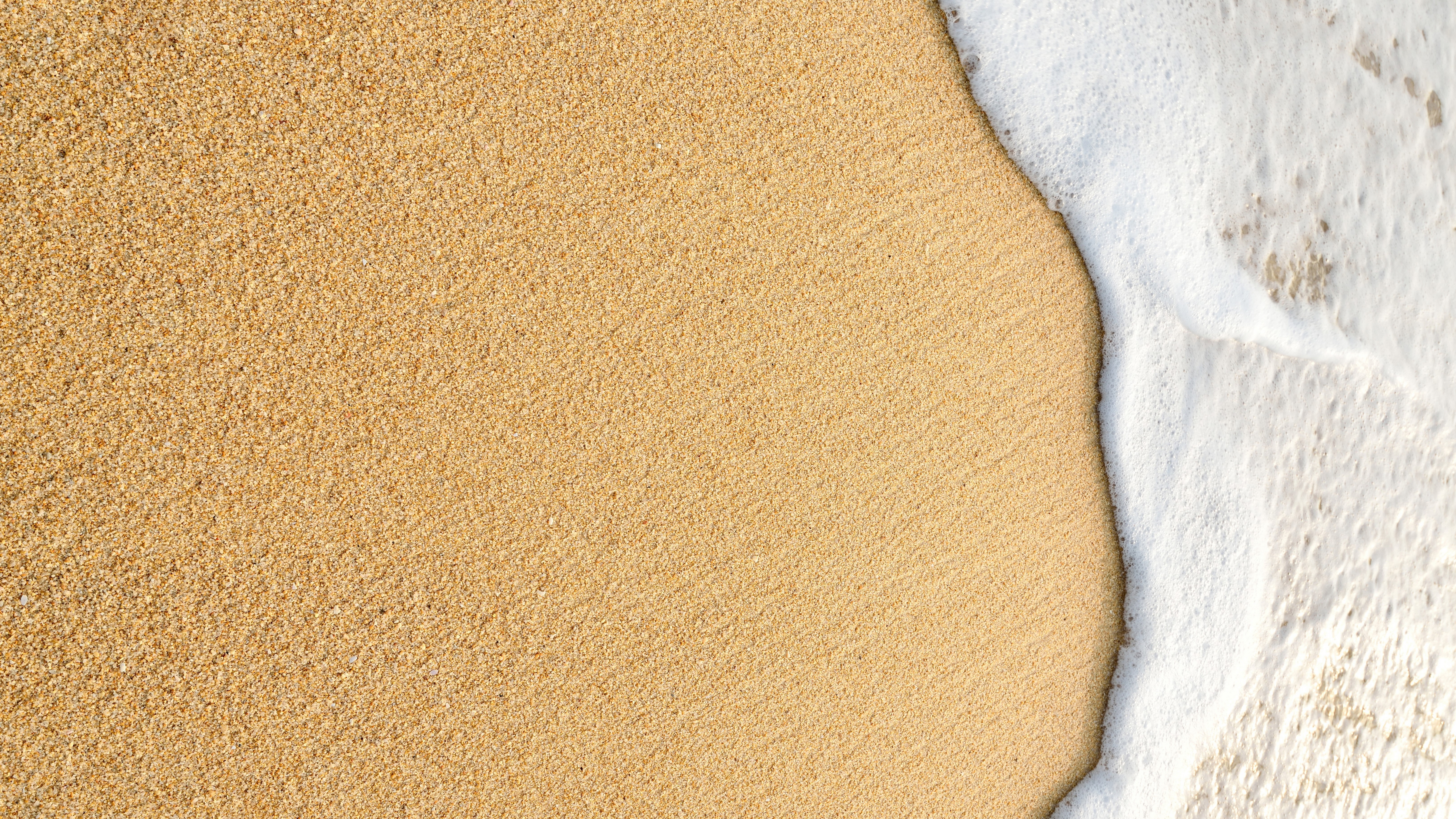 Description: A sandy beach with a wave coming in to shore and a white surfboard on the sand and bottom of the sand.