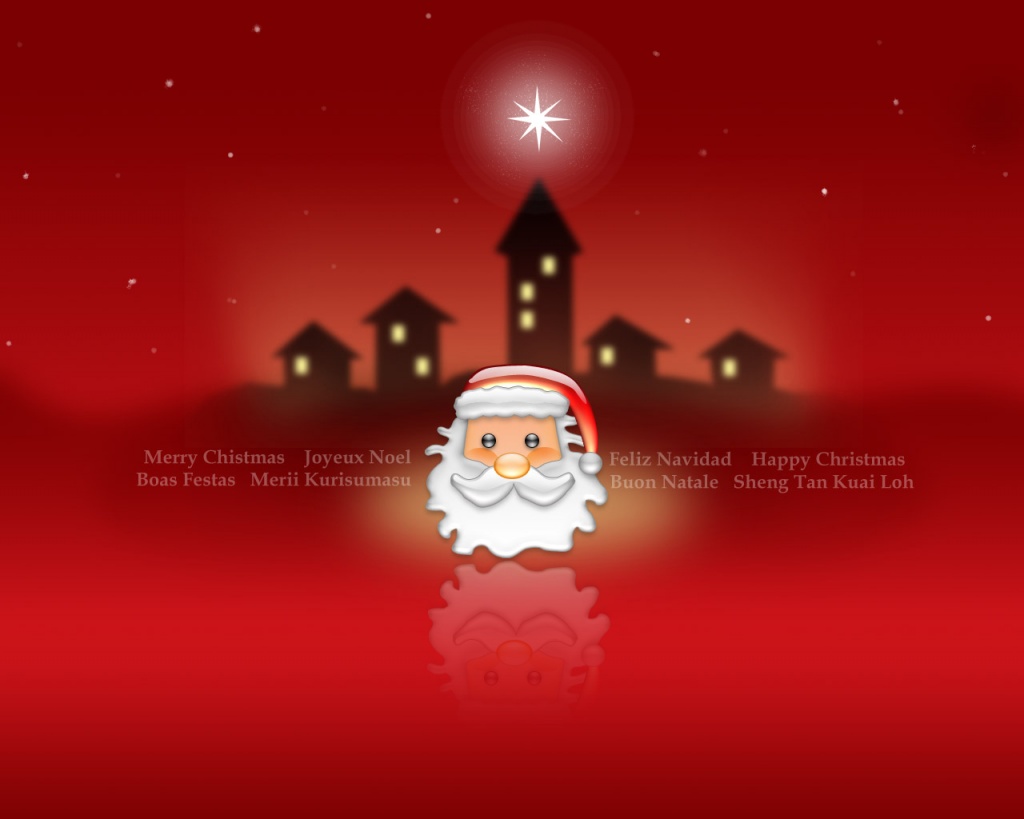 Description: A christmas card with a santa clause on it and a red background with houses and a star above it.