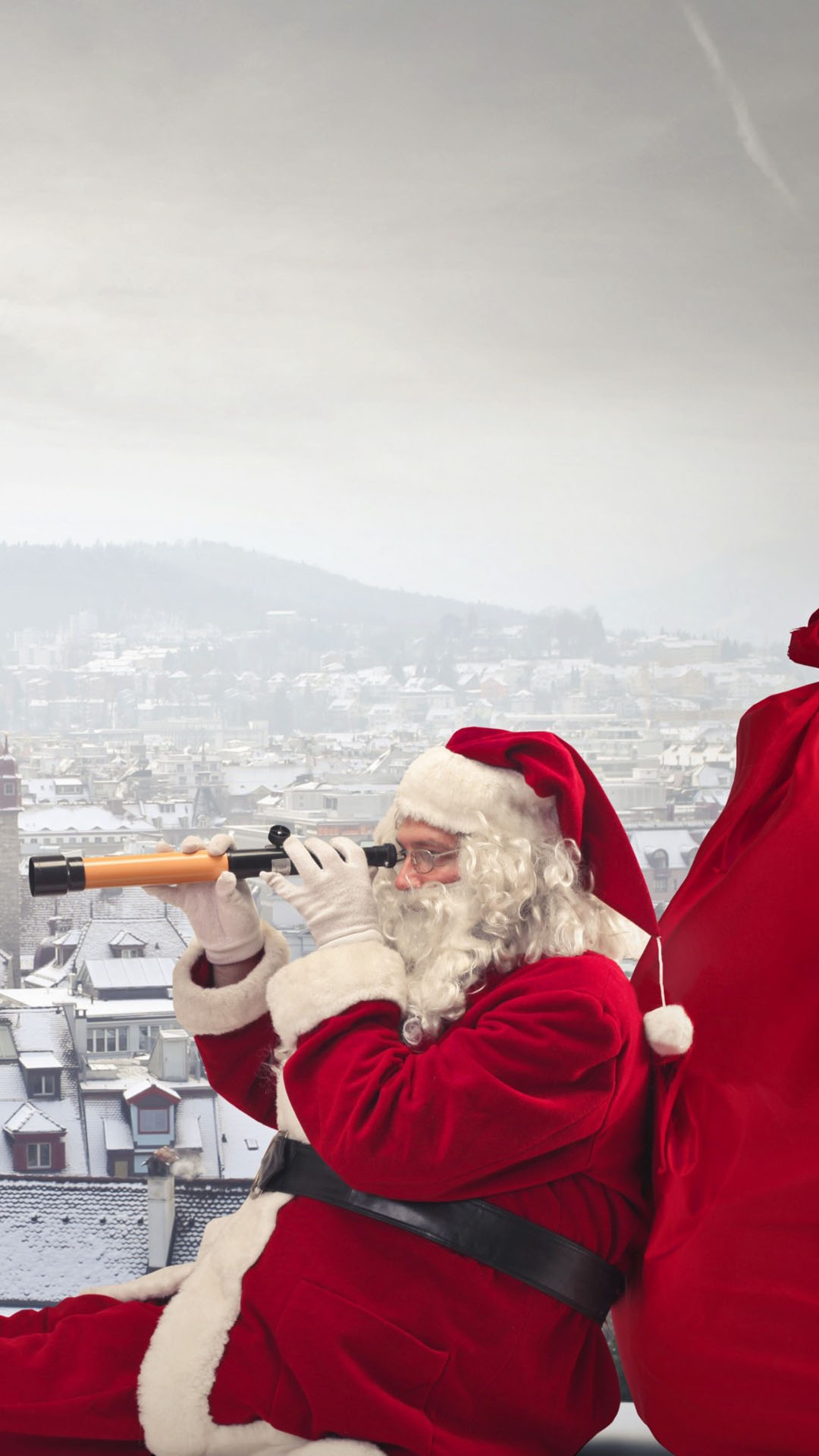 Description: A santa claus looking through a telescope at a city skyline with a castle in the background and a person dressed as santa claus.