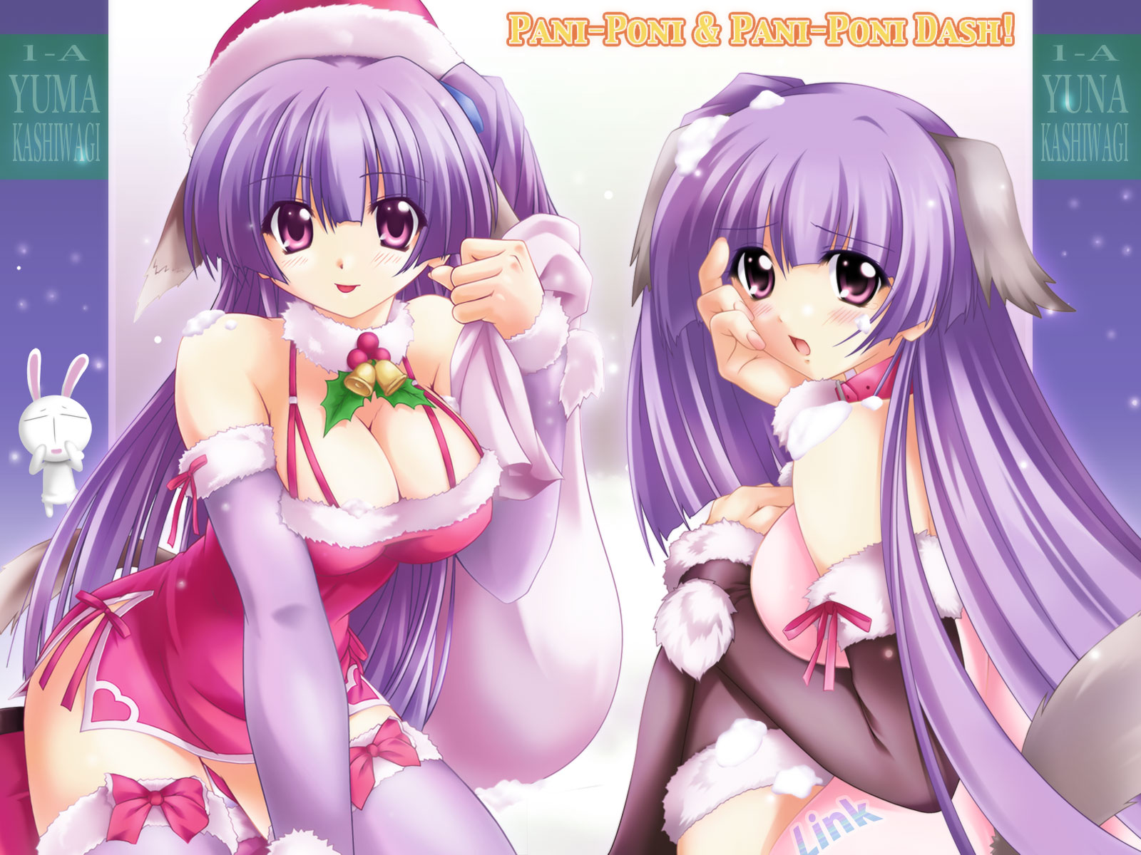 Description: A girl in a santa hat and dress with a bow on her head and a bunny ears on her head.