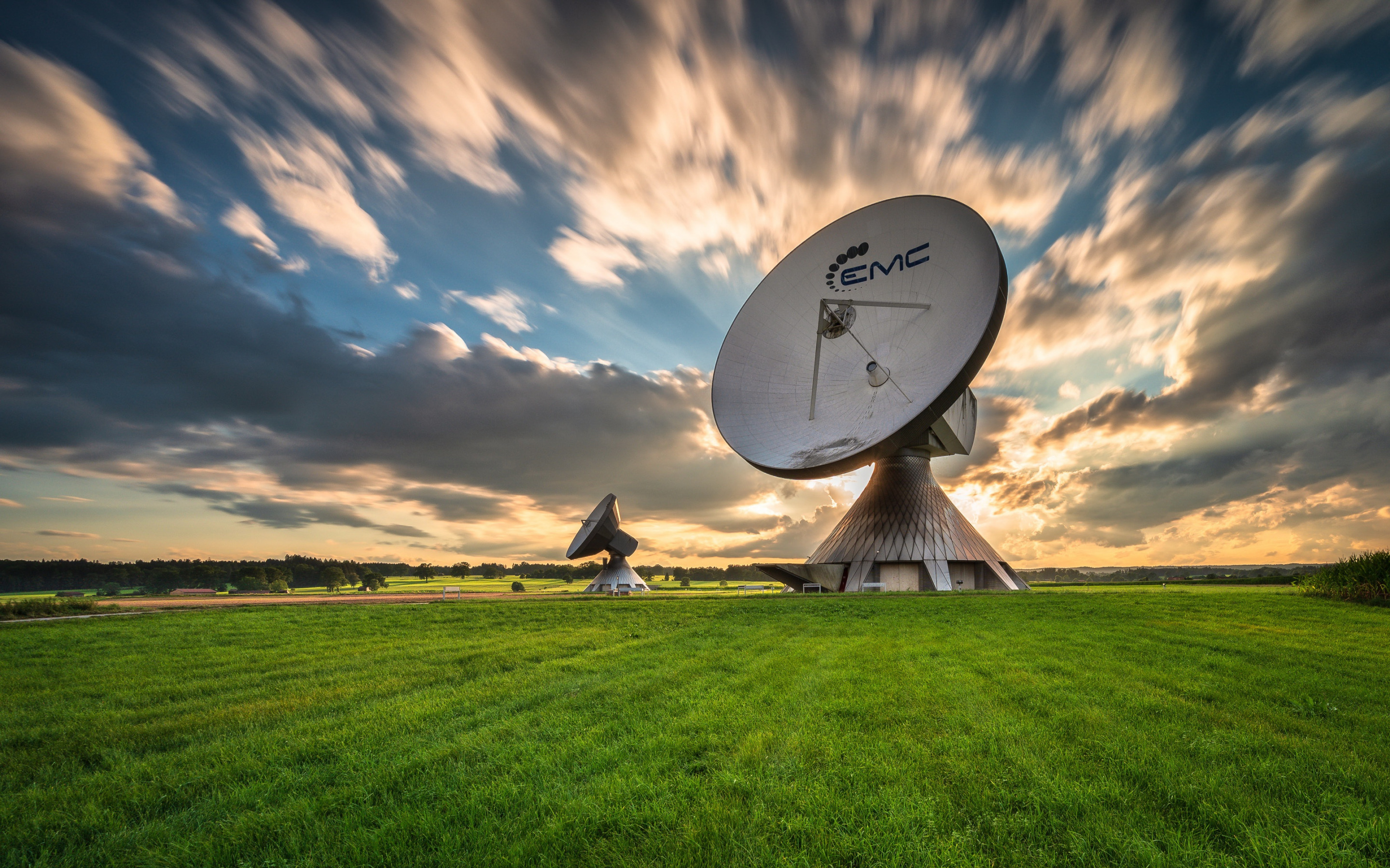 Description: A large satellite dish sitting on top of a lush green field under a cloudy sky with a sun setting.