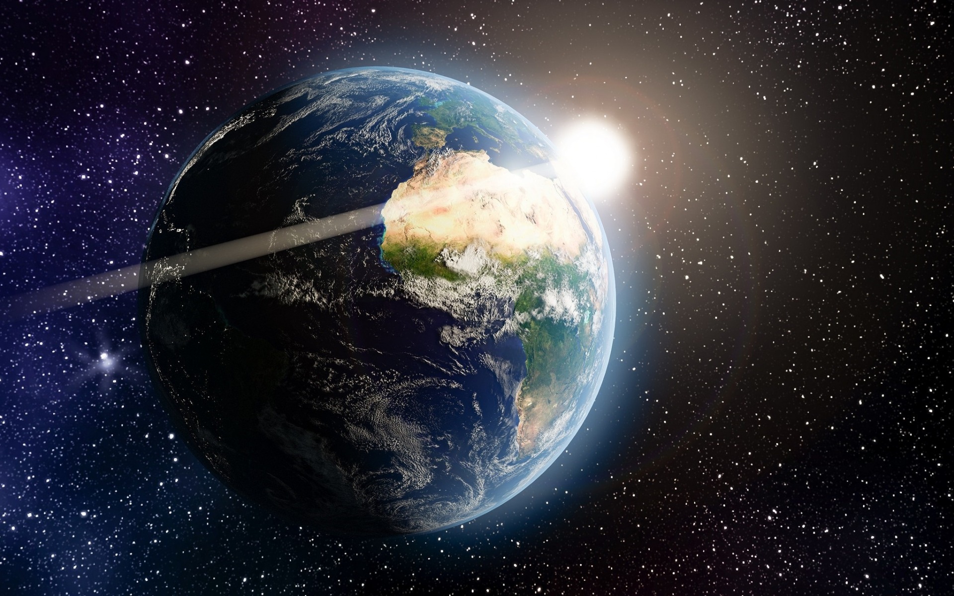 Description: A satellite satellite flying over the earth in space with a bright beam of light coming from it's center.