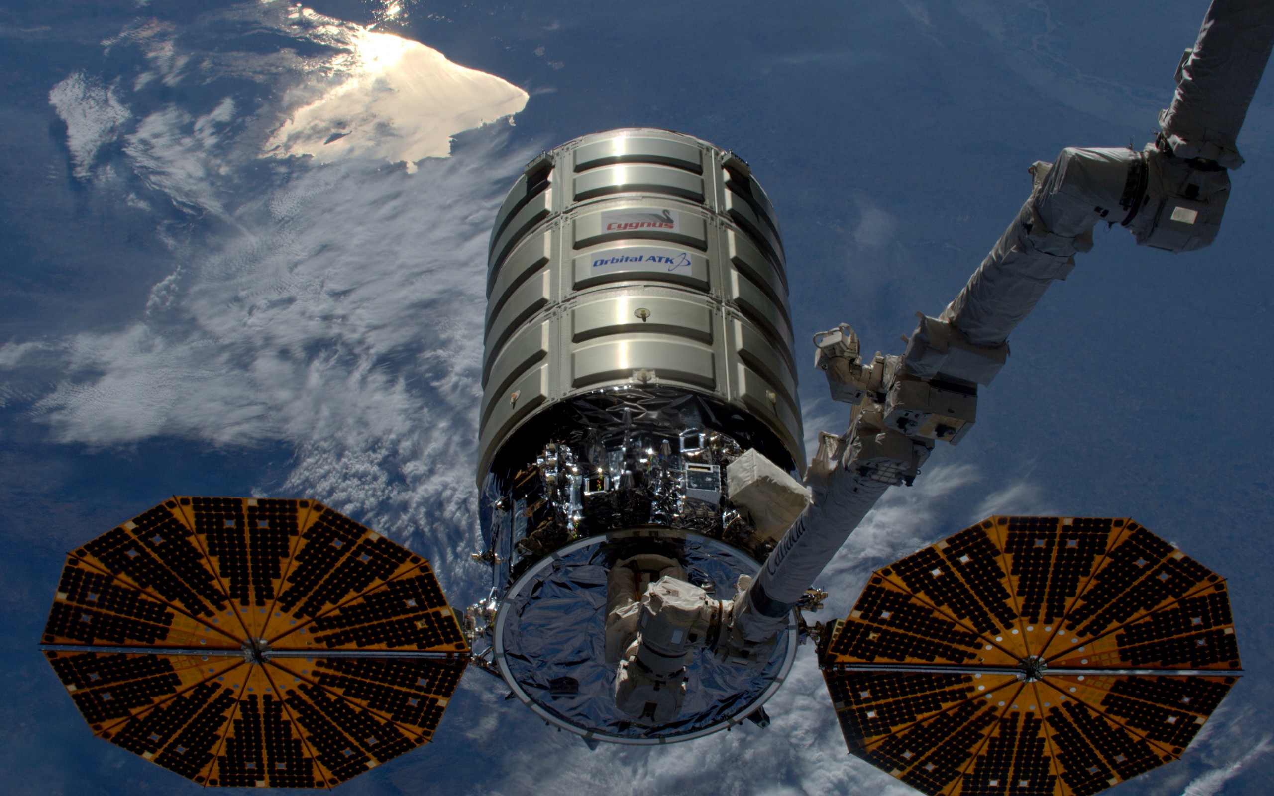 Description: A satellite satellite in the air with a sky background and clouds in the background.